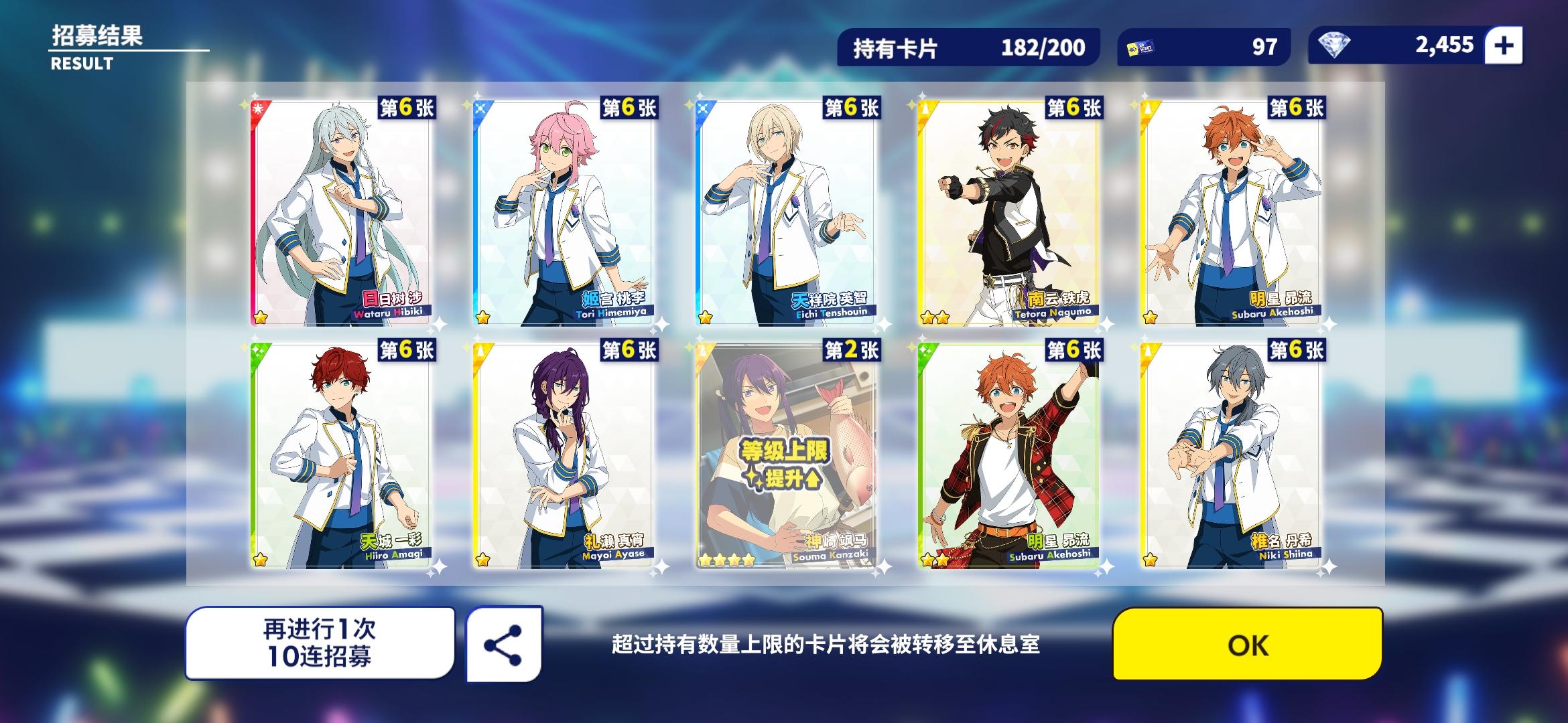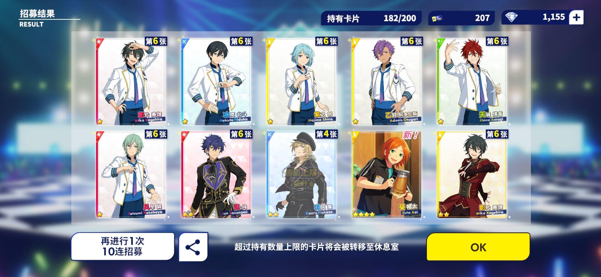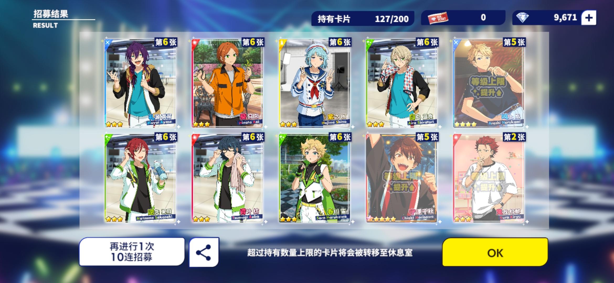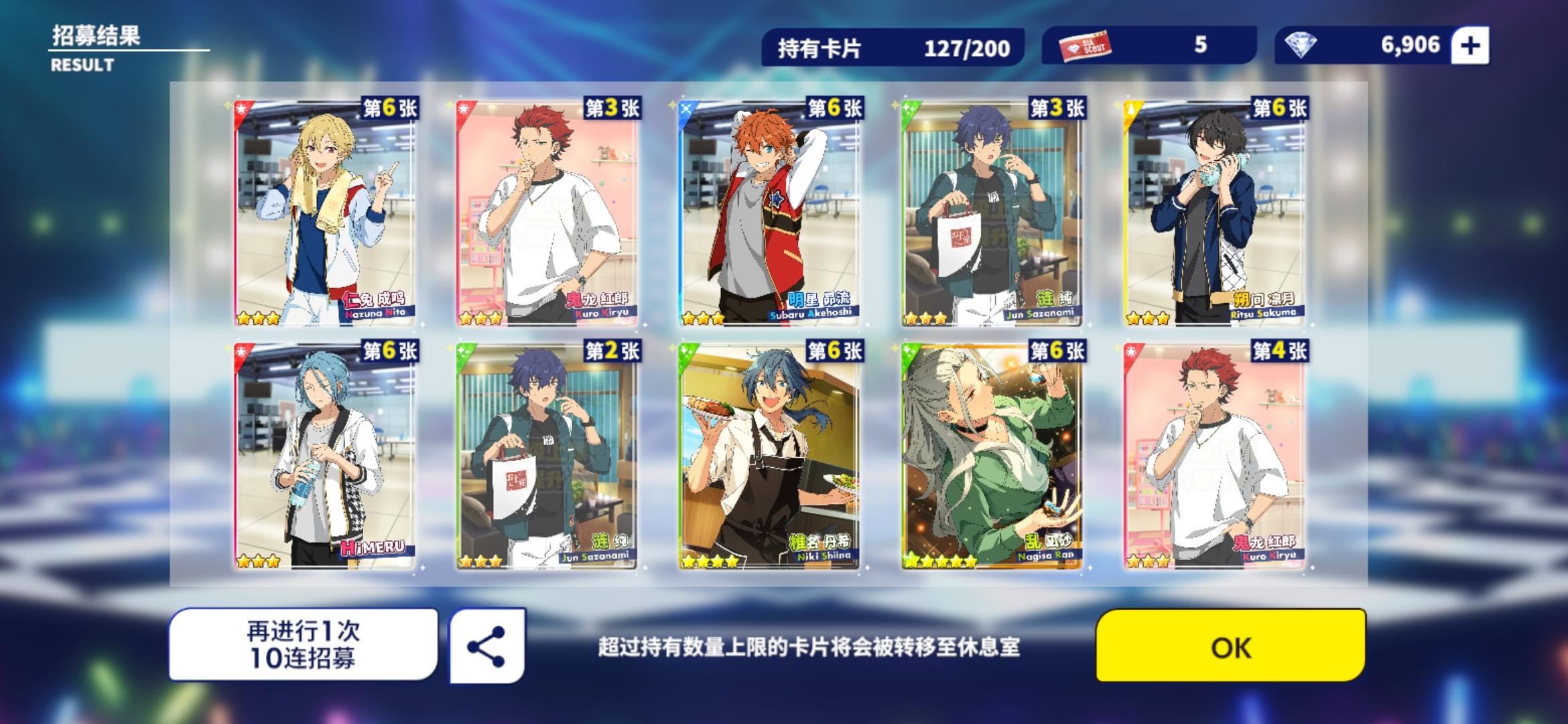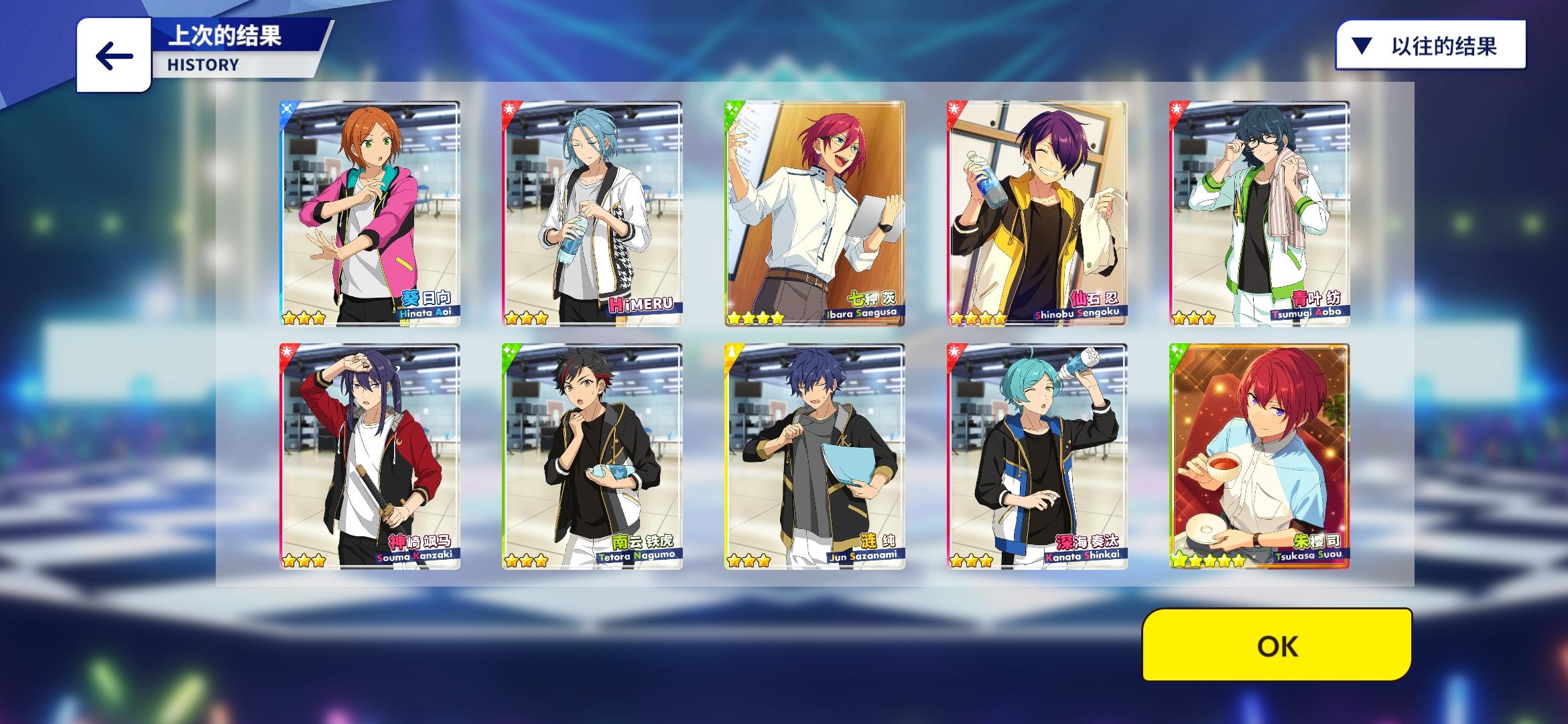 11次十连,s5歪了个已经有的糖醋鲤鱼,s8出了宗叔,s11才出。剩下的全都是黄光。我服。我昨天星光闪耀也忘记做了。现在整个人都不好了。下期还是我推,钻已经没了,当场去世!