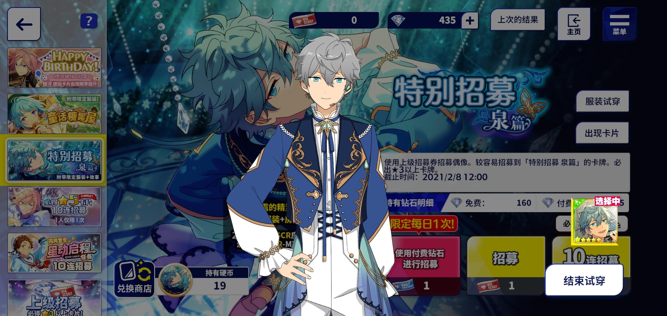 本来说着过几天开新池子了攒一点钻抽新池子!因为有红头发哥哥,但是!从入坑看到这个招募开始就心痒痒,因为蓝色的头发真的太好看了啊!!!!!!还有那个标签“朝霭的精灵”!!(这不就是在引诱我吗!??? 新手30发全献给他了然而不是歪了就是歪了还一连歪了4个,这个谜一样的概率能不能改改每天都在成为歪池大师。今天又狠心抽了20发!!!!!!妈妈!!!!!精灵来我家了!!!!!!!!!!!呜呜呜呜呜呜