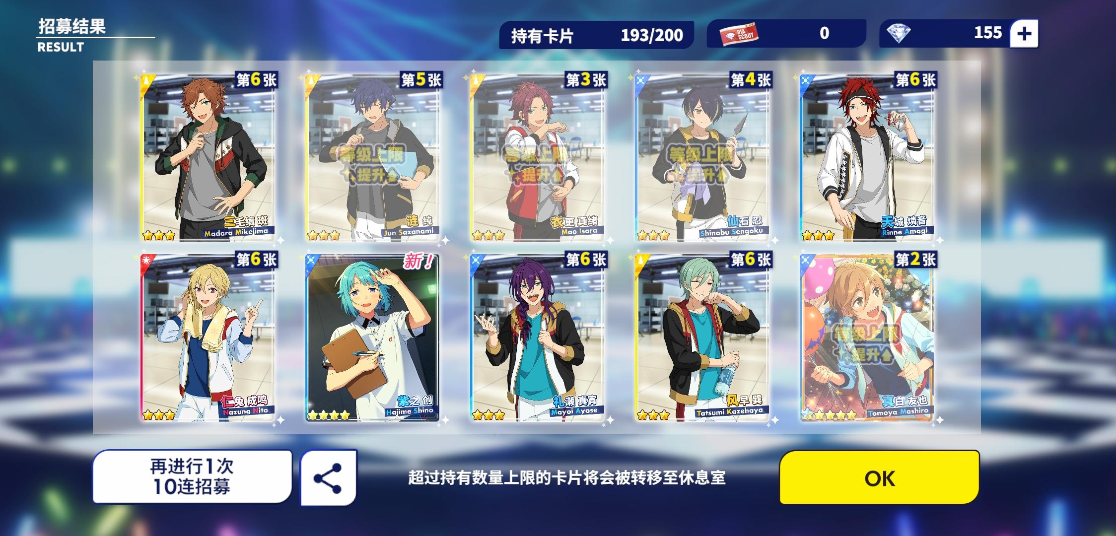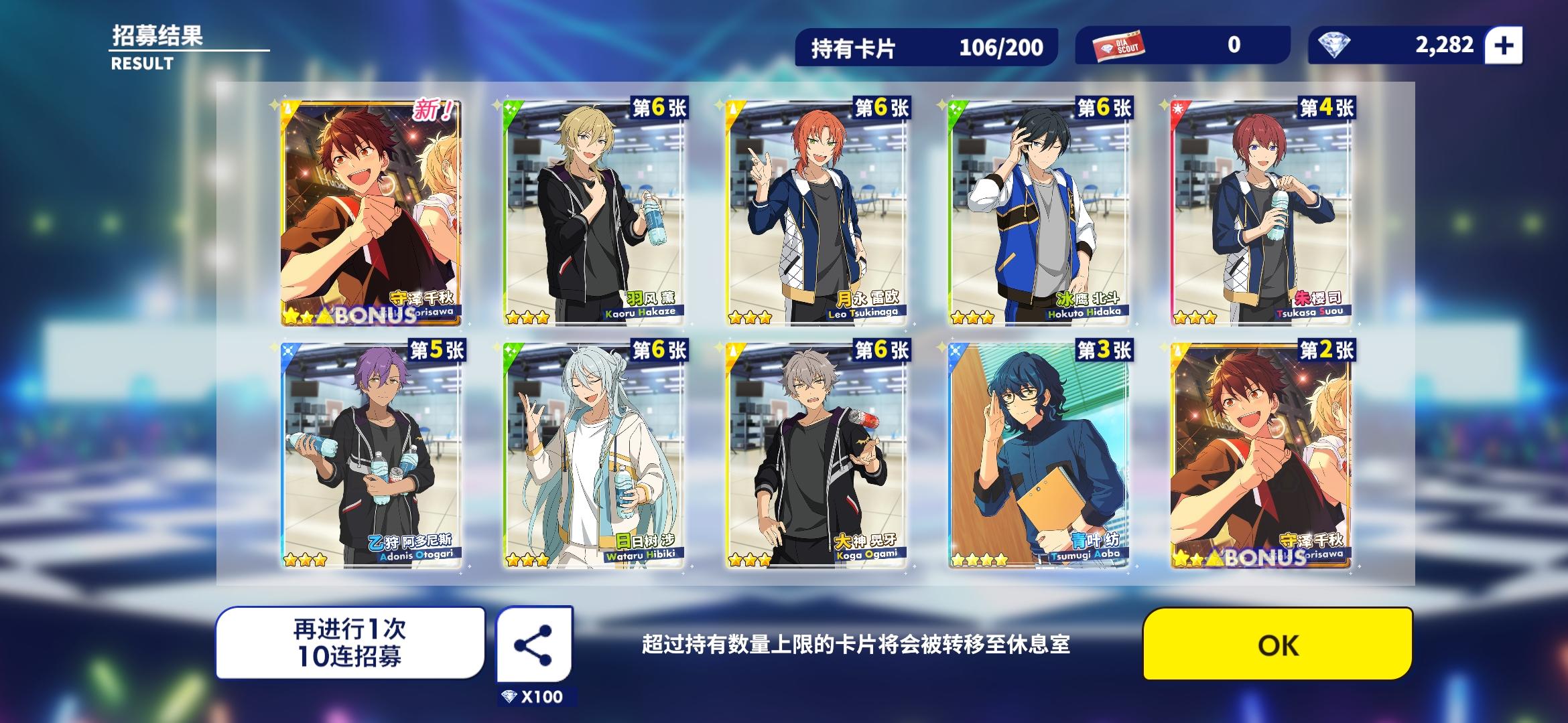 我觉得我的卡池有毒,歪就歪的一批,而且就看英智和宗老师两个人在那里相爱相杀,反正我只要出了宗老师,下一发十连必出英智,就连之前mika的卡池也是,100多发,在活动结束前的那个十连出了mika,英智,还有凪,然后新的活动池,第一个十连是宗老师第二个又是英智。。。我???至于吗?!!