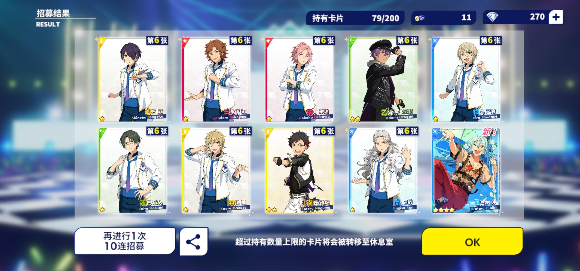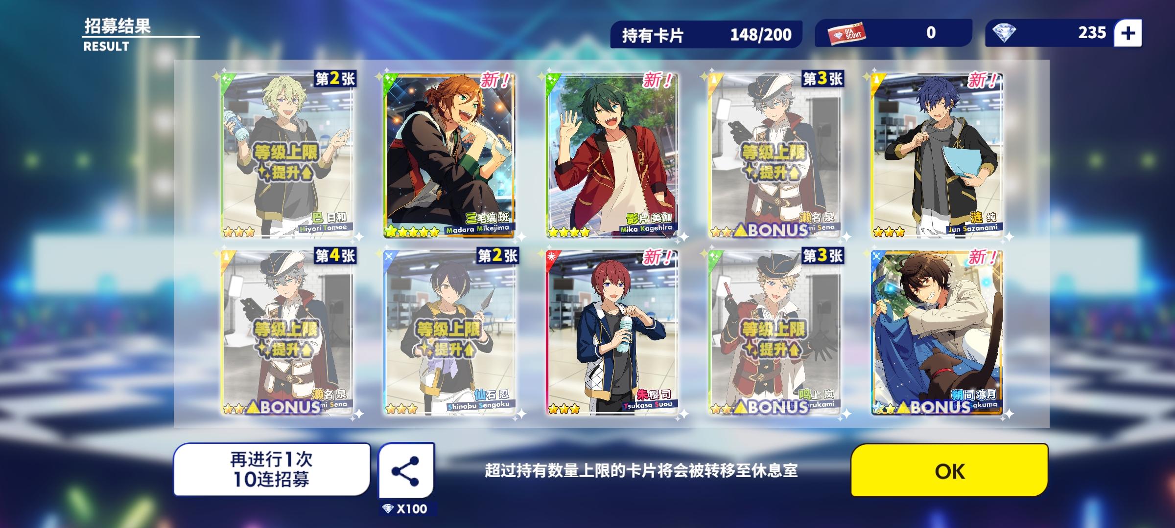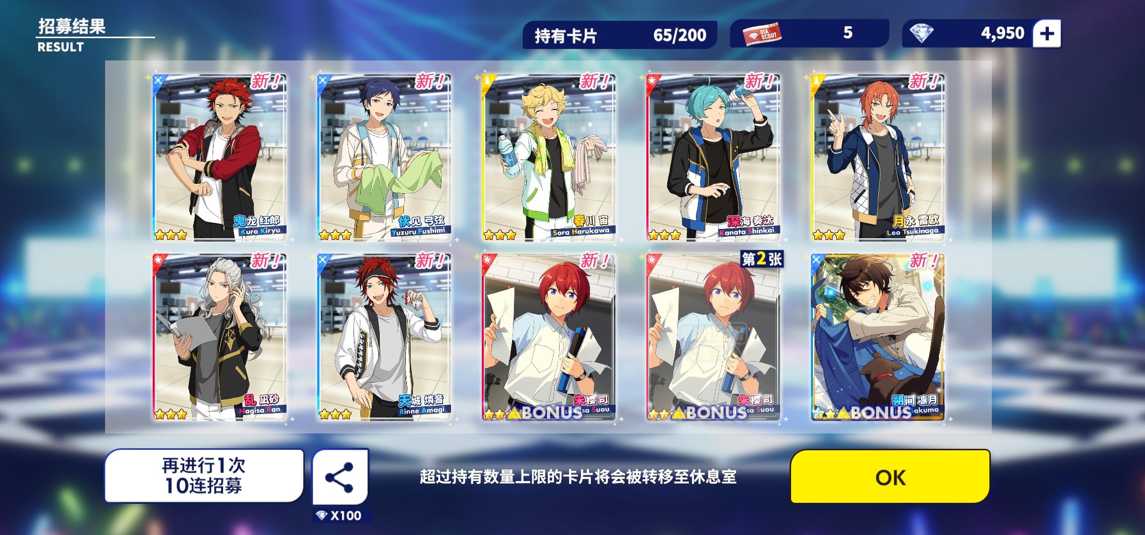 零氪党,这是第三十发了貌似,本来第一瞬间看到斑有点失望,斑过了美伽(还挺惊喜的),结果最后一下出了凛月wr啊啊啊啊啊啊!!!本来新手太爱凛月了选了他,导致开服一个五星都没,现在一下来了个双黄蛋,太快乐了