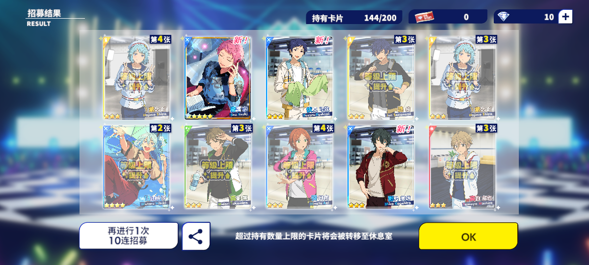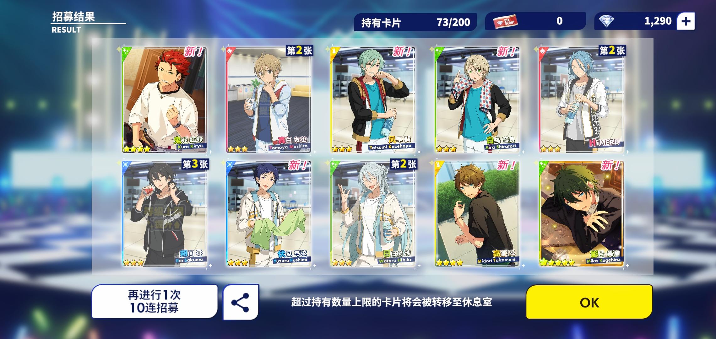 零推死活抽不到,就开了张自选嘎朔间零的梦嗐,小号也挺欧,两个池子一共30发,第一发四星保底,第二发就是栗子,然后双黄,嘶舒服噗噗,然后就是零的人设崩塌现场(噗嗐,还没有矿给零开衣服qwq大概算是晒卡吧