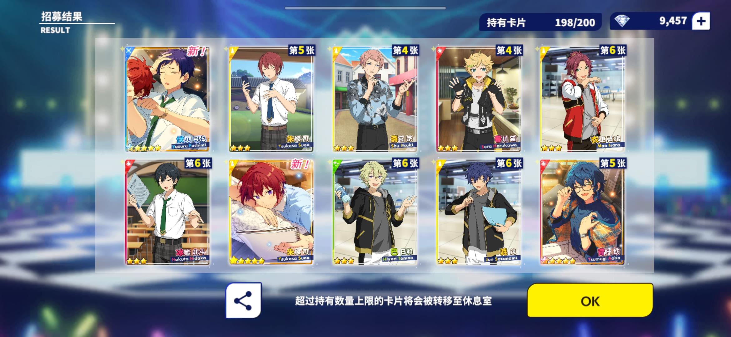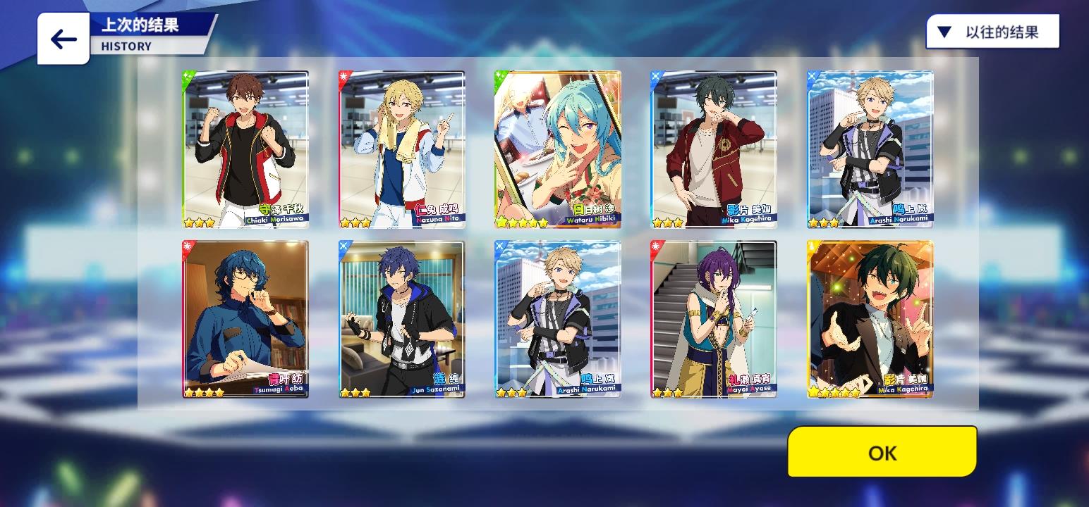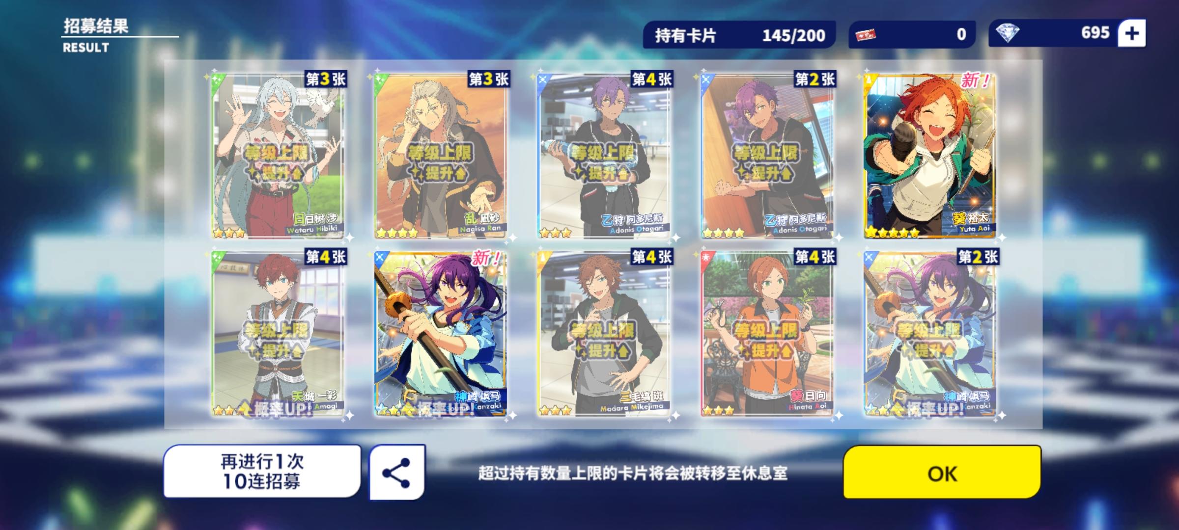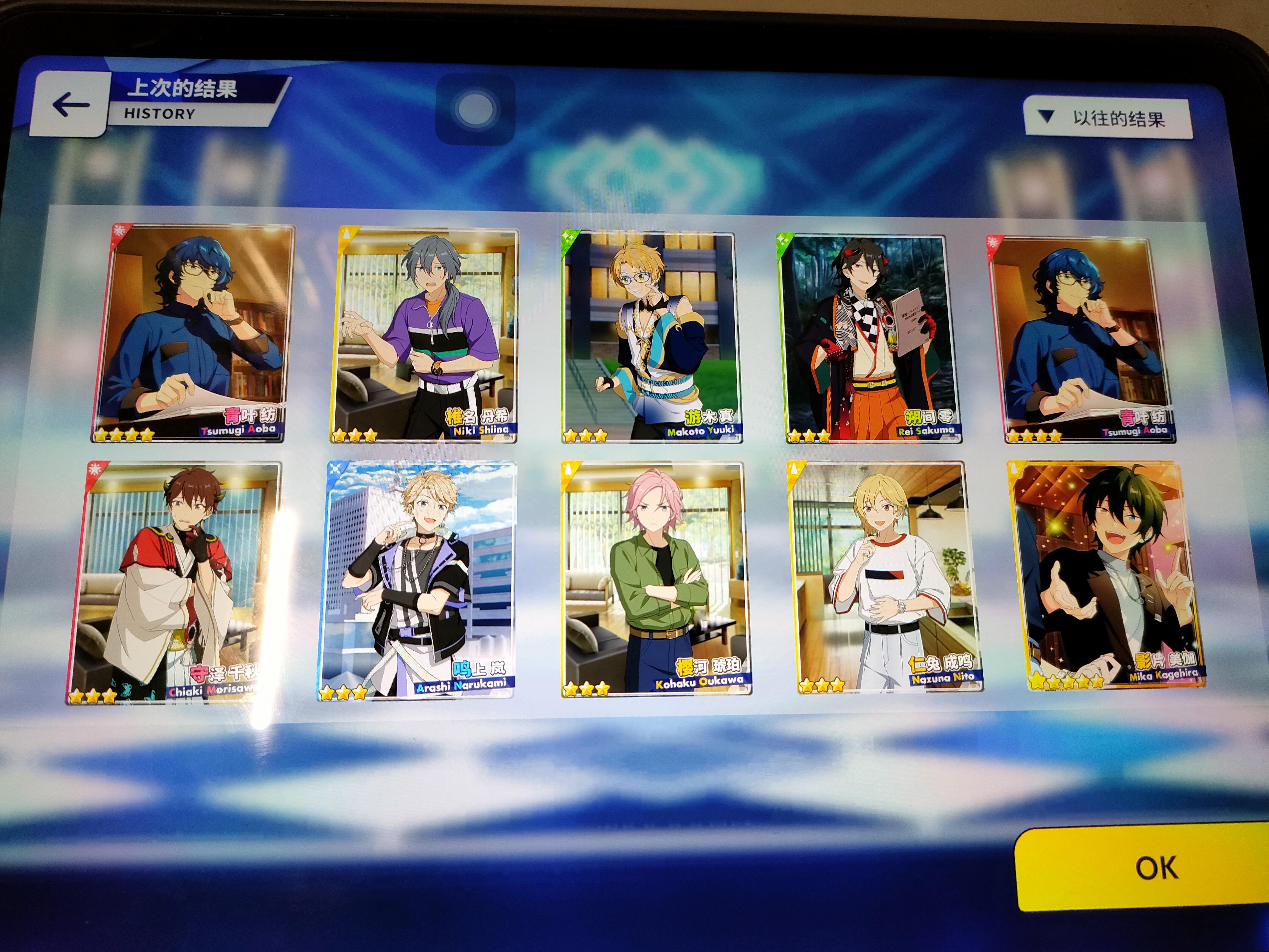 最近的阳寿抽卡:试水十发出了小咪 今天生日限定抽卡三色五星 两张新的一张纺我直接抽满破了