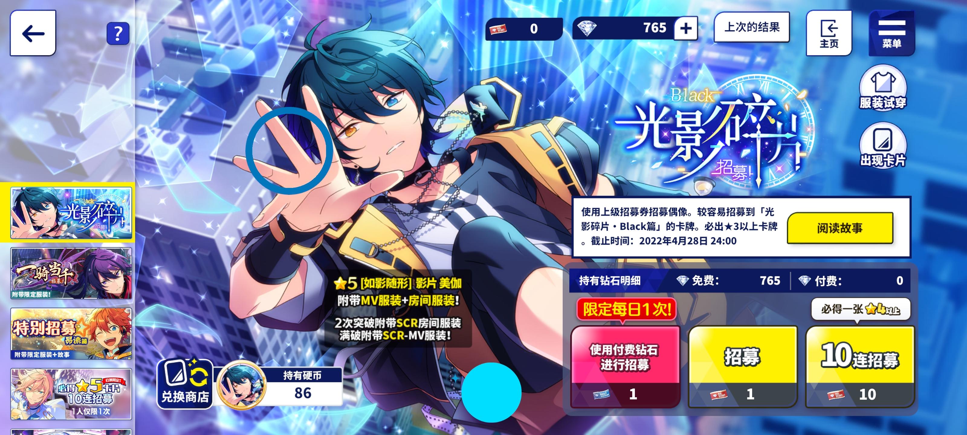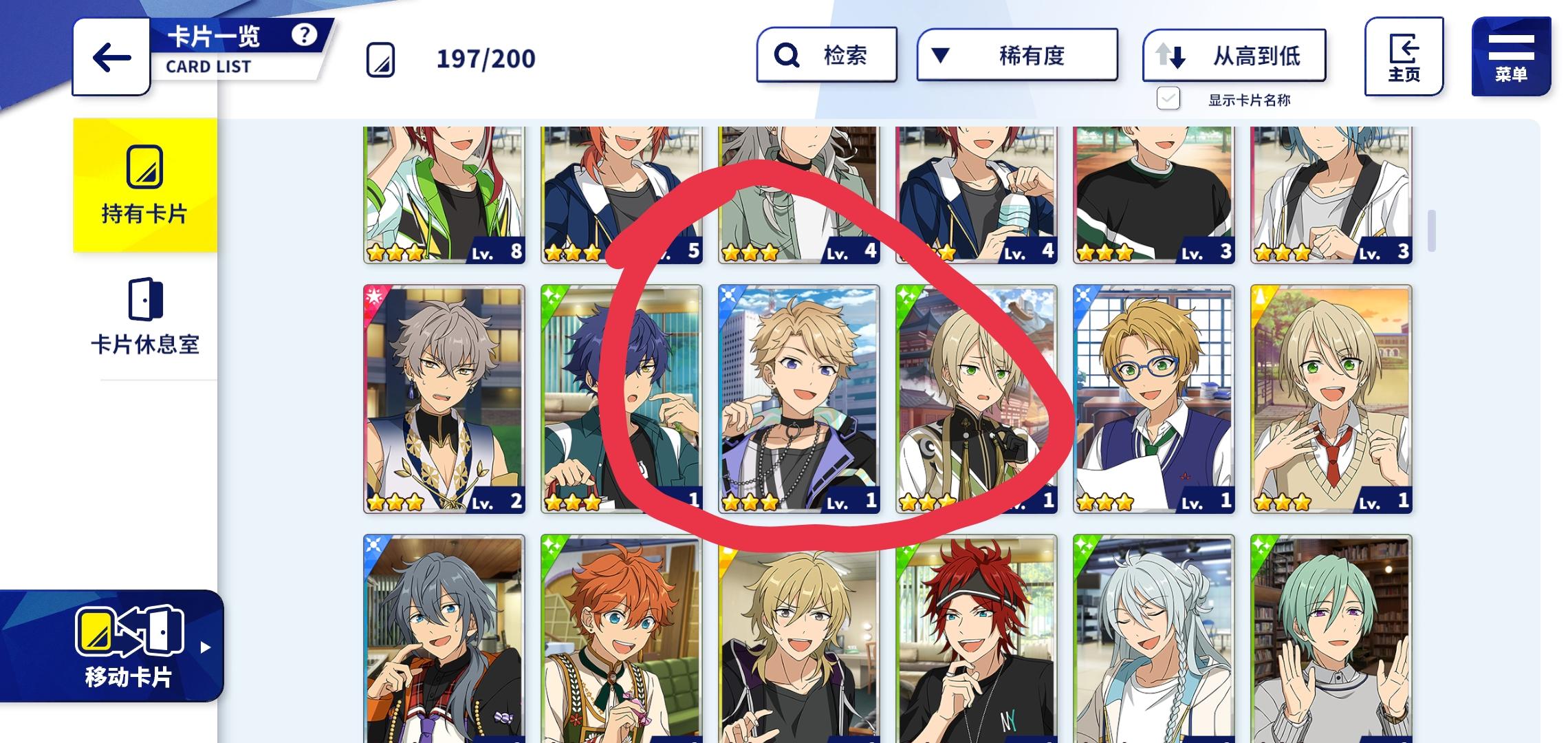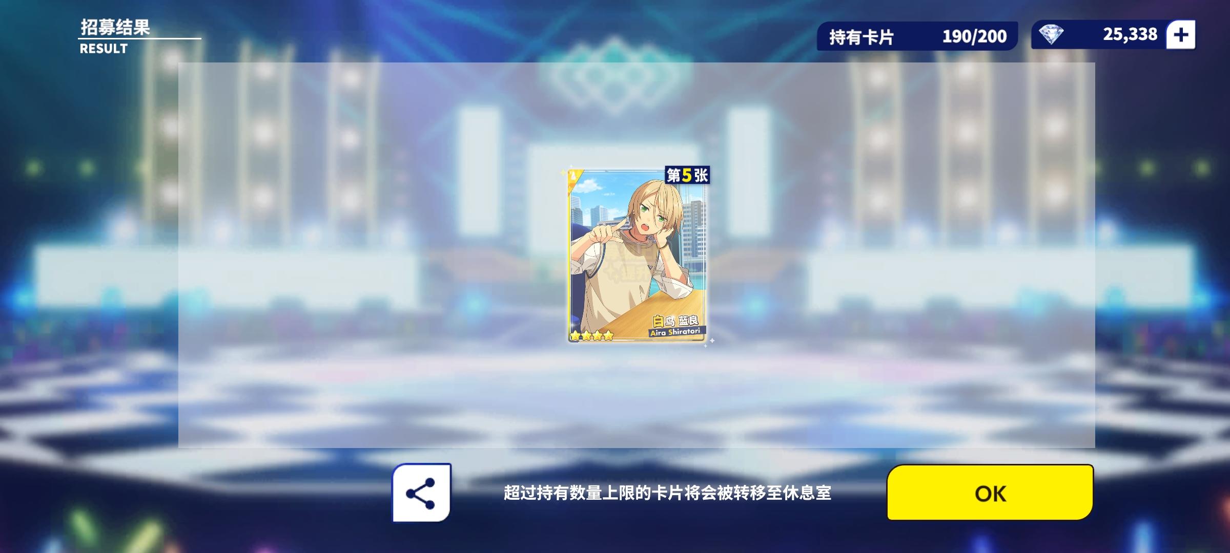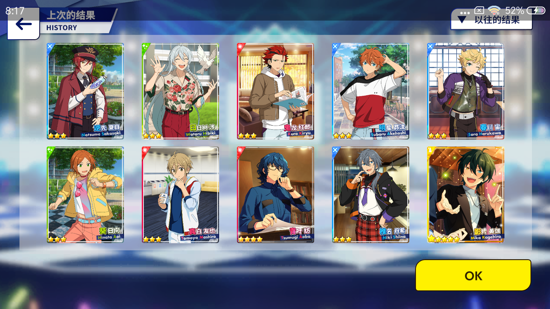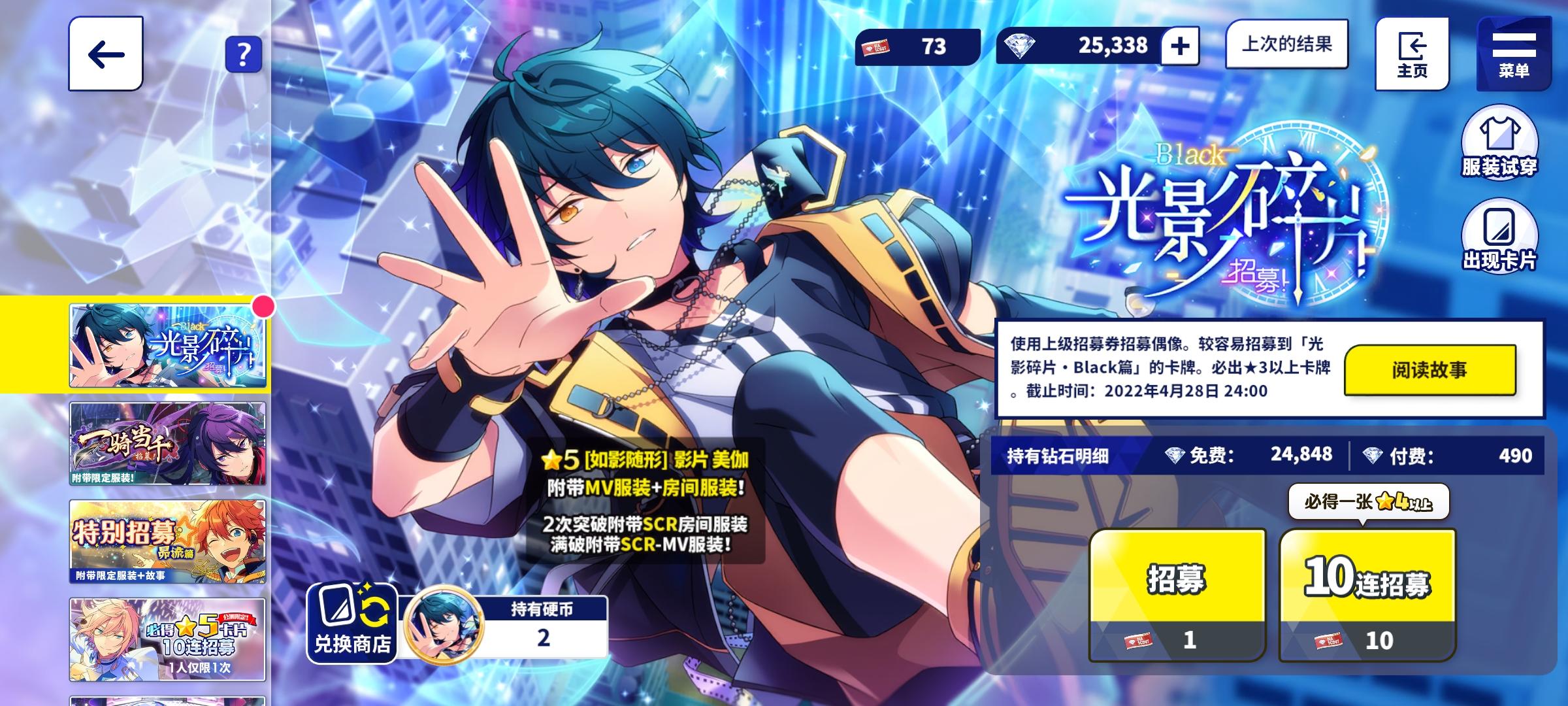 最近的阳寿抽卡:试水十发出了小咪 今天生日限定抽卡三色五星 两张新的一张纺我直接抽满破了