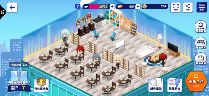 入坑一个多月啦,今天终于把事务所升到七级了!集齐五个人了芜湖!记录一下东西还没买全,差四张床和一个绣球花盆呜呜呜努力攒钱ing