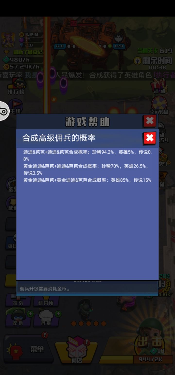刚进入,首先要尽快合成10级兵(废话了)屯资源(尤其是金币),等到每天豪爽的官方给出648钻石时,你就要搞事情(搞传说)了❗❗❗这个转盘是最容易得到传说的,几个10连传说100%就出来了,接下来如果还有空余的5k钻石,建议买2个黄金10级兵礼包会给你一个传说(第一次合成是这样滴)【高级佣兵】第一你要加入一个高活跃的工会❗❗❗为什么呢,因为工会挑战的宝箱会给你大量的10级兵(不活跃就是少量或者没