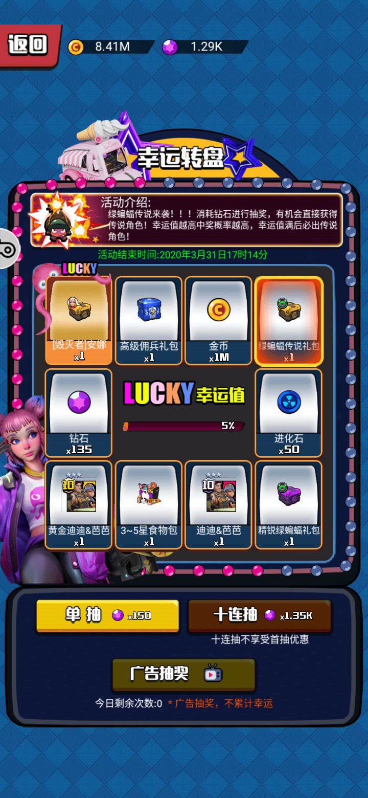 开局给什么不记得了,随便升级强化一下就好,等到晚上6点发完6000钻福利之后就开始十连吧,这是最好获得传说的来源,没有之一,开始我选择了2500换黄金战车的误区15%的概率还未必是安娜。当然安娜不是最厉害的,但是对于我们来说她肯定是最厉害的也是第一个7星的,没有之一转盘能保证每若干次她都来。有安娜就要安心刷绿蝙蝠的地图了。前期即使浪费了一些金币和强化材料都不要担心350磕几个马上就回来了