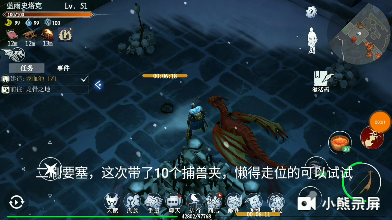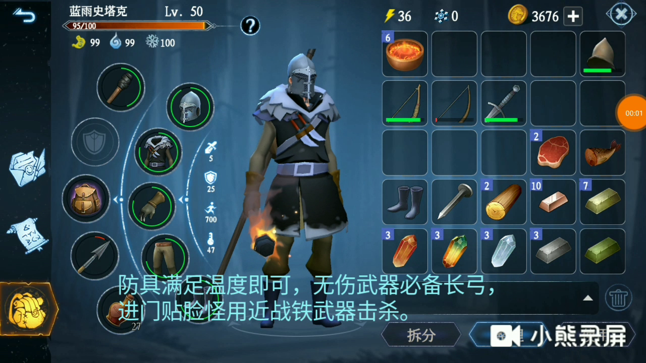 很多人都不会刷图,教你怎么在最短的时间里刷最多的资源,天赋技能温暖一定要点到2级,这样可以穿2级套来回不用担心温度。首先怎么带装备,武器如果有龙力技能就带铁矛,小怪一刀一个,这样就不会被小怪打,省衣服耐久,带铁矛只要带俩套衣服出门,然后随地捡材料做衣服,没有龙之力技能就带铜矛铜剑,如果是带的铜武器就多带一组布,细线随地捡。铁矛我推荐带4把,武器不够可以随地捡材料做铁矛,如果是铜武器至少带6把,三级