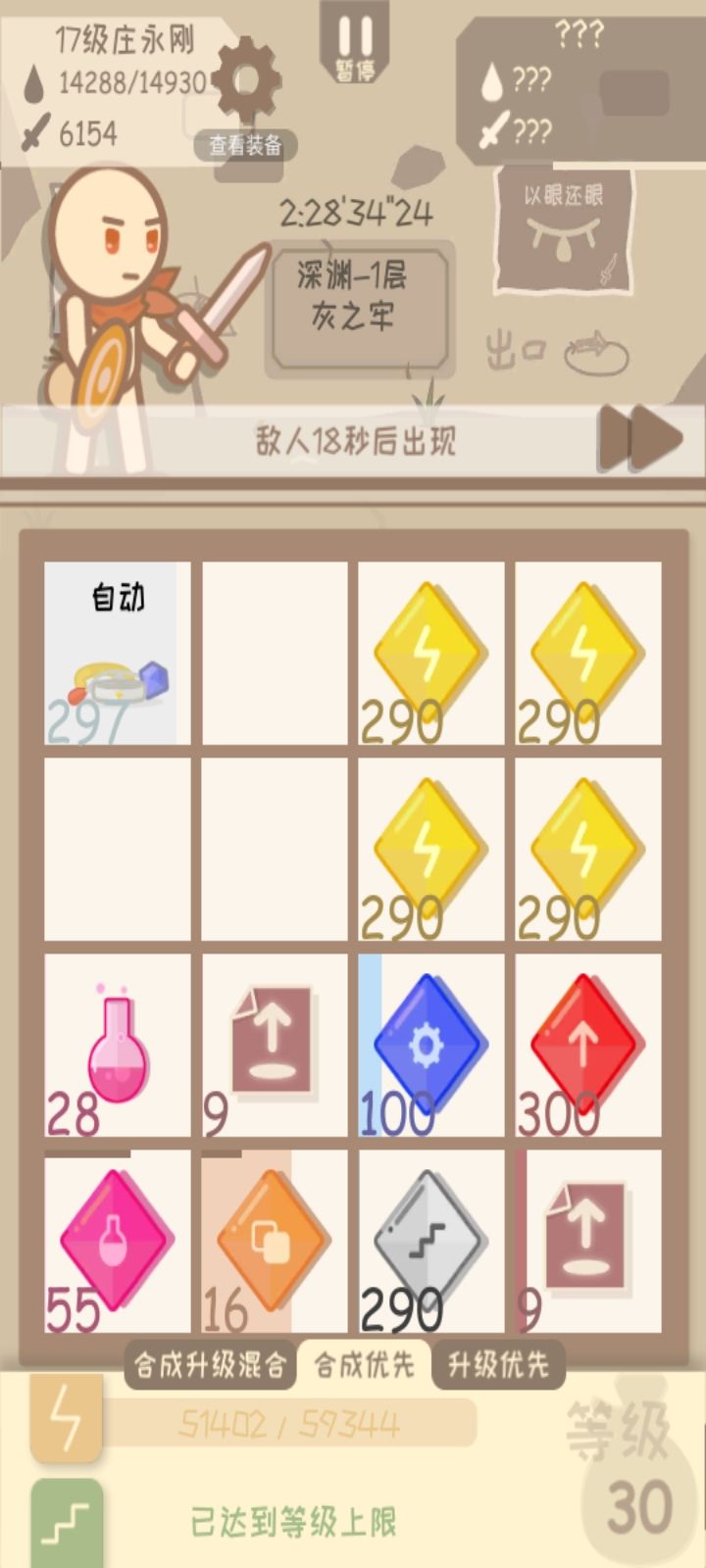 7换掉神圣的剑,打败怪物,遇见商店,买进入下一层的符文2张(其中一张可能会用掉,可用“复制水晶”复制)升到满级,装备也是。