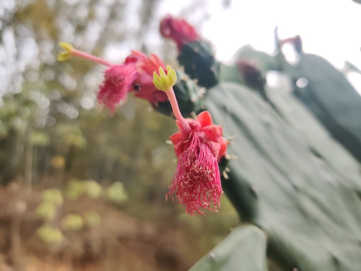 仙人掌花像是一支毛笔,花谢之后,红色部分会全部掉落,留下一个窝,果实有大拇指粗,成熟后酸涩微甜。像这种花序是不是没有出现过呢