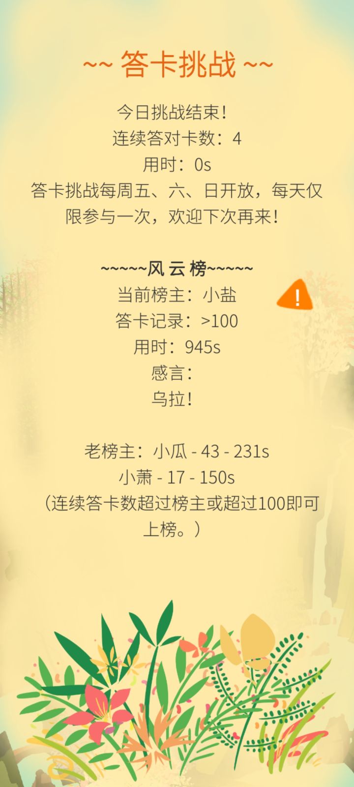 没有答错也没有手动结束答题,连续答了50张卡,完成任务拜访完邻居家回来一看我的答题结束了,记录零秒连续答对四张我的鸟叫呜呜呜
