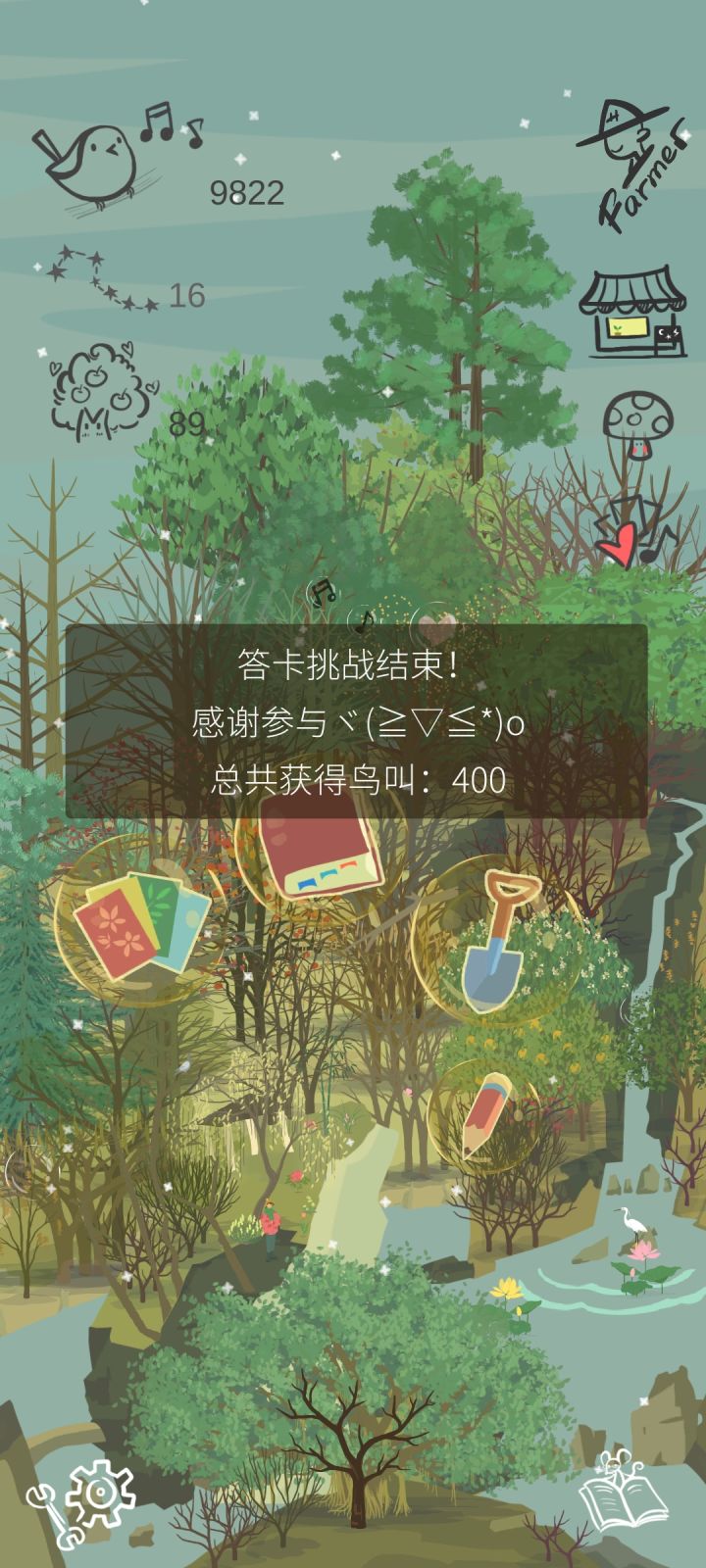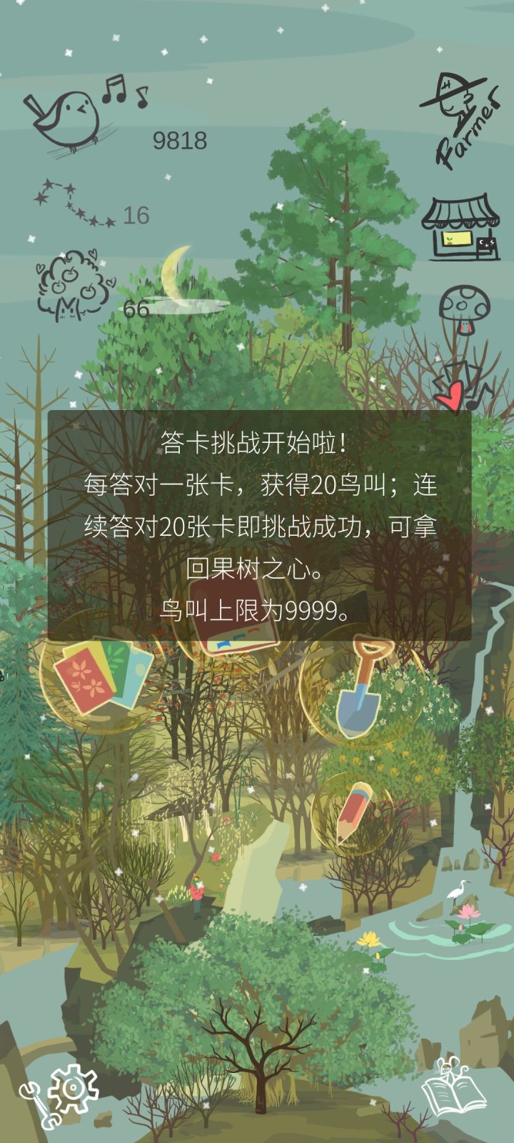 如题,答卡挑战开始前是9818,答卡期间怕达到鸟叫上限,时不时给树续缘,基本维持在9800左右,答卡挑战结束时是9822,它显示获得鸟叫400,但鸟叫数量并没有变化。如果是因为快到上限了,那也应该是加到9999啊,这种情况已经第二次了,看论坛里没有反映过类似的,不知道是我哪里理解错了还是操作有问题。