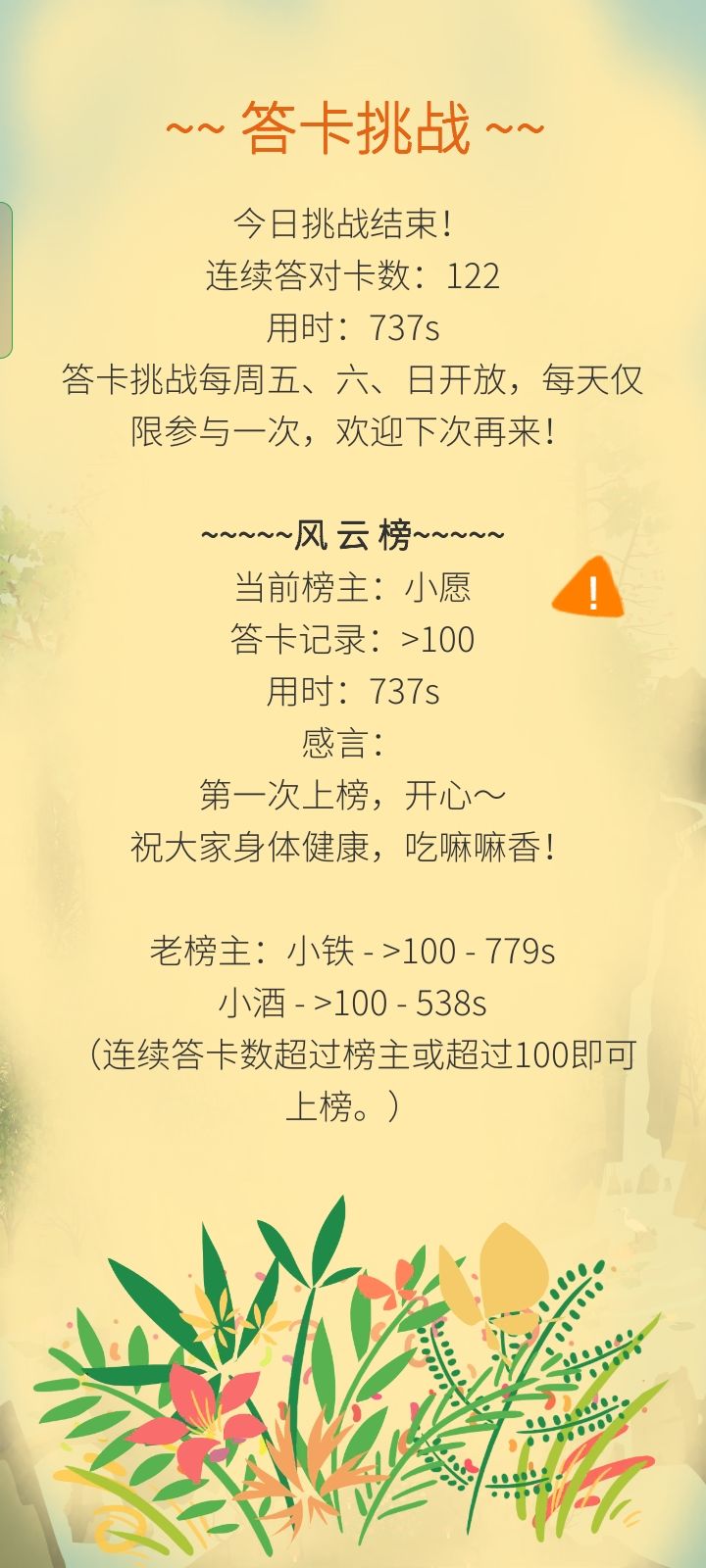 第一次当榜首,记录一下~话说到了一百题之后好像就没有鸟叫了,我答了二十几张才注意,然后就故意答错了。是设计如此吗?感觉有点亏呀~祝大家天天开心呀!ε٩(๑> ₃ <)۶з