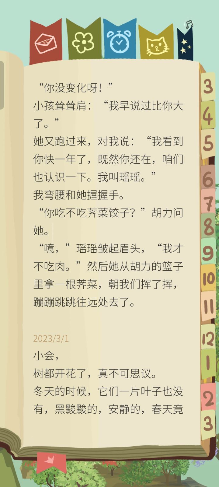 书本右边的便签显示可以跳转2022.03到2023.03,但是3月以后的就没有了!最多到今年3月20,后面的就没了,好难过,我好喜欢今天的信,没截上图就没了!!😭😭