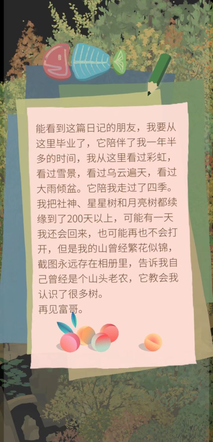 如果是这样,那我打算从这个游戏毕业了。我种下的第一棵树社神桃已经活了500多天了,那么我玩这个游戏已经一年半多了,该种的树都种遍了,稀有树种子都攒了好多,之前买的500张奖券也已经全部用光了,是时候放下这个游戏了~~虽然还有很多太阳花种子没有种下,虽然目前还有很多光瓶没有用完(闪电瓶我攒了39个呢)。。。