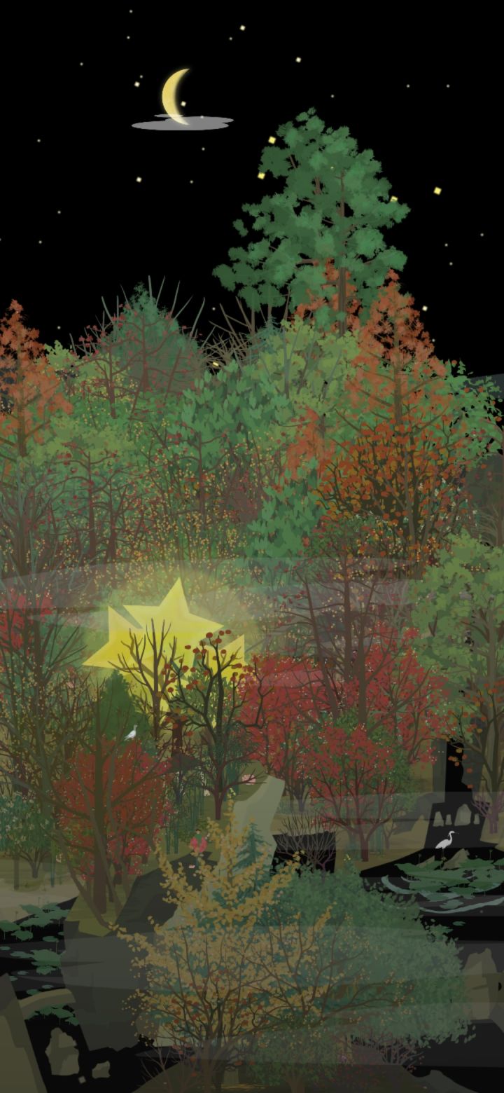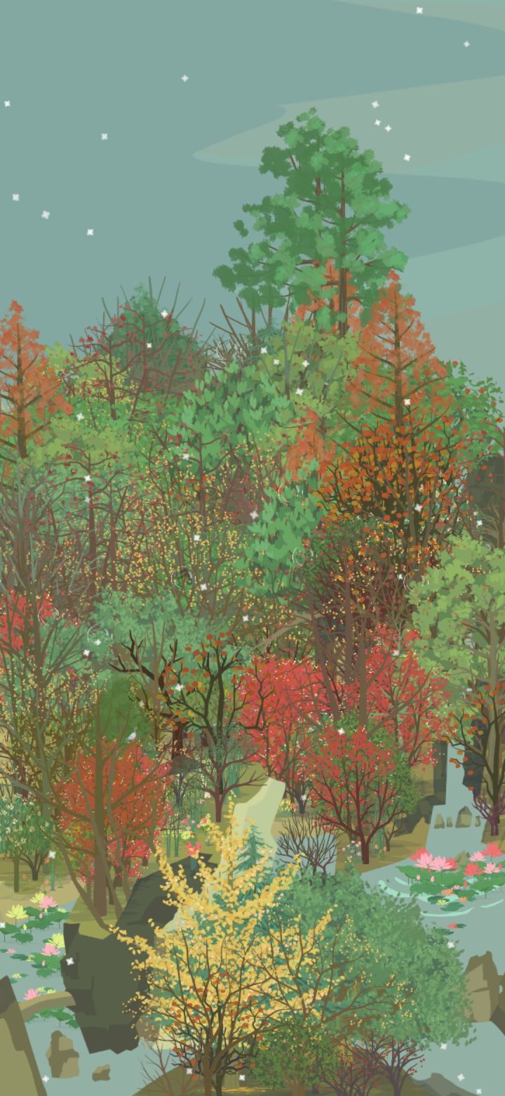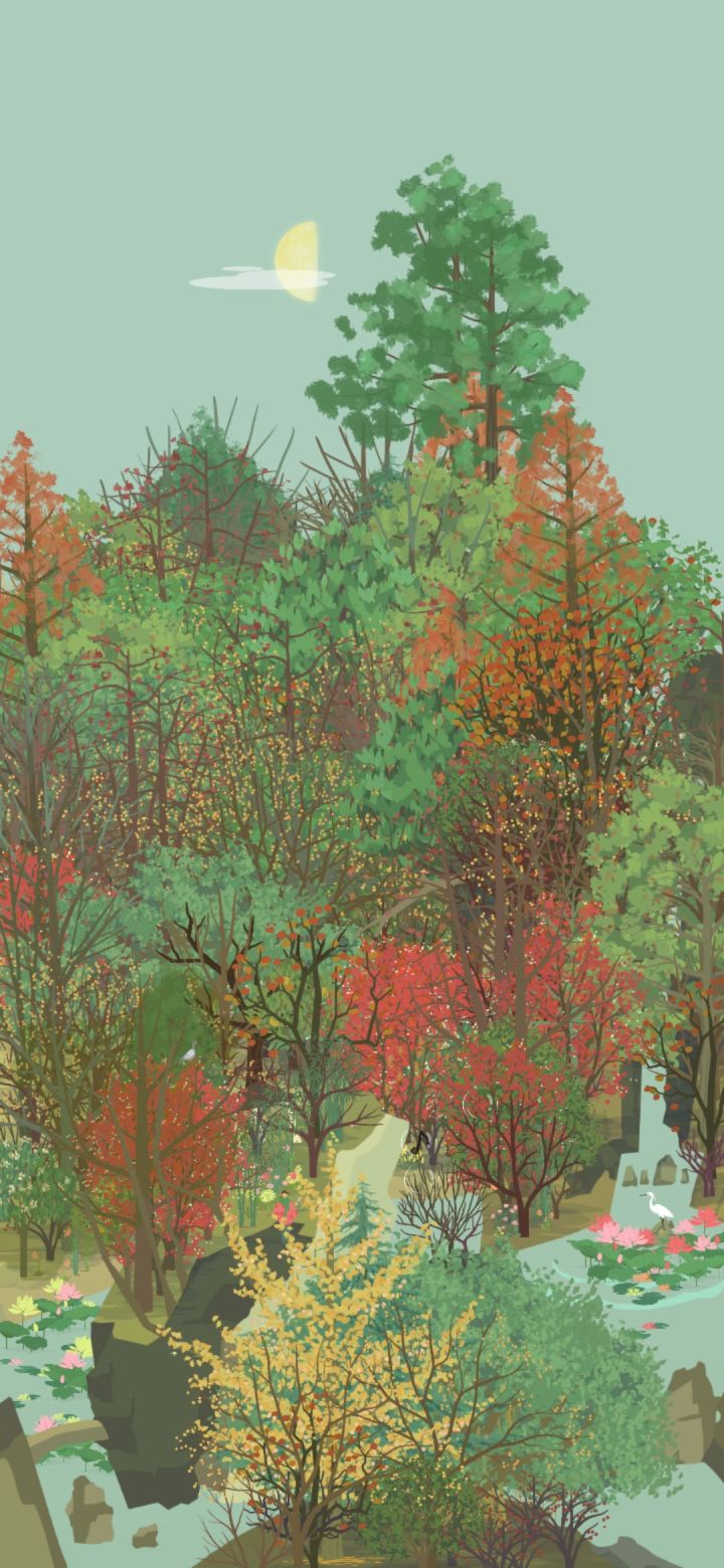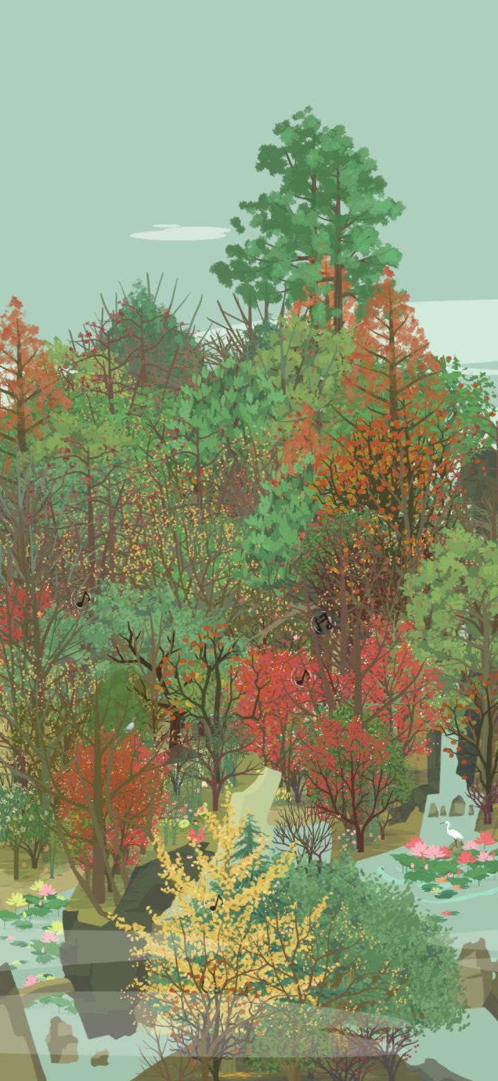 小会,院墙上的爬山虎的颜色变得斑驳,夏天绿色的墙,变成了秋天彩色的墙。秋雨连绵,风吹着潮湿的树叶,洒满山林。银杏亮晶晶黄澄澄的叶子在风里摇摆,落在我的衣服上。我不敢走得太快,怕风把身上的落叶吹走,便撑着伞在红黄斑驳的山里慢腾腾地走。路面湿漉漉,细雨吹湿衣服下摆,拿手一拂,就湿淋淋的。林子里没什么泥,到处都是厚实的落叶,不像我们小时候在山下跑,遇上大雨之后,连鞋子都陷进泥土里。一只蘑菇冒出头来,细杆上顶着大脑袋,享受雨水润泽。