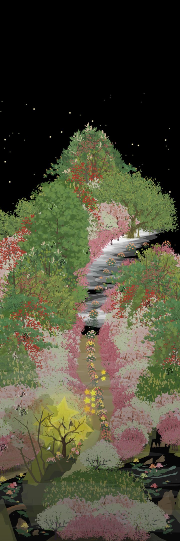 目前就这样,栾和棟还没长出颜色来,去掉了山坡的乌桕,改成凤凰木和合欢的拼色了,还没长出来,等全都开花了一定很好看