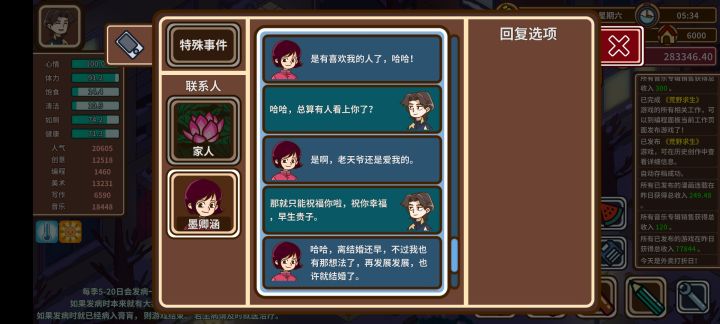 我玩病号音乐男(陈居亿),两年时间爆肝,获得年度漫画家、年度音乐制作新星、年度独立游戏新星。以下是我的攻略以及抱怨1爆肝:这个游戏时间是关键,需要分秒必争。这个游戏有个机制:人物只要没死,就能干活。只要避免人物死亡,哪怕状态再差也能干活。音乐男有三种死法,第一种熬夜处死,只要睡到自然醒就可以恢复,小case。第二种,健康归零生大病死亡,多买点饮料加健康,小case。第三种本身的疾病,去医院,小c