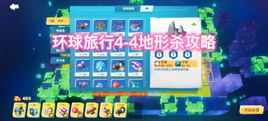 本期带来环球旅行4-4地形杀的打法 目测还有许多可以优化的地方,应该可以节省1~2个地板(冲榜的话可以试一下) 前期要根据怪物路径放陷阱,有的时候开局走上面就放上面;有的时候走下面就放下面;有时候两边都走就都放一个横向弹板+尖刺 第二波同理根据怪物路径放制冰机,求稳的话就不要提前出怪了,让制冰机有足够的时间造冰 宝箱优先考虑减体重,减CD#糖果灾难攻略
