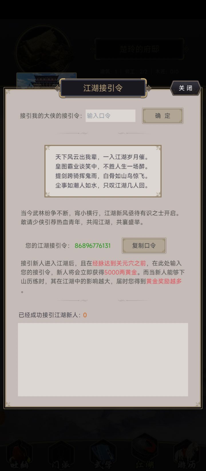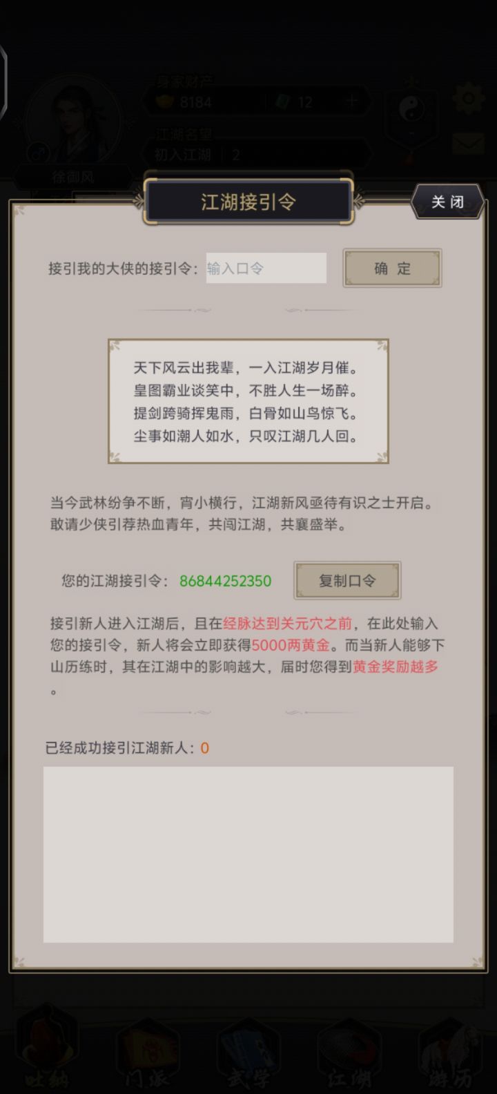 #这就是江湖攻略 入门攻略:1.在江湖—玄武门—江湖接引使处,输入86827691236(赏善罚恶)接引令,可以立刻获得3000黄金。2.在江湖——丰泽坊——集市一层用240两黄金购买2颗大还丹或20颗小还丹,打开包裹服用,然后点击修炼至二阶五层,让功力自行运转。依次点击门派——当值长老、江湖——百晓生居、江湖——通宝阁、江湖——庆余堂、江湖——丰泽坊获取大侠之路章节,在庆余堂中购买绿色装备