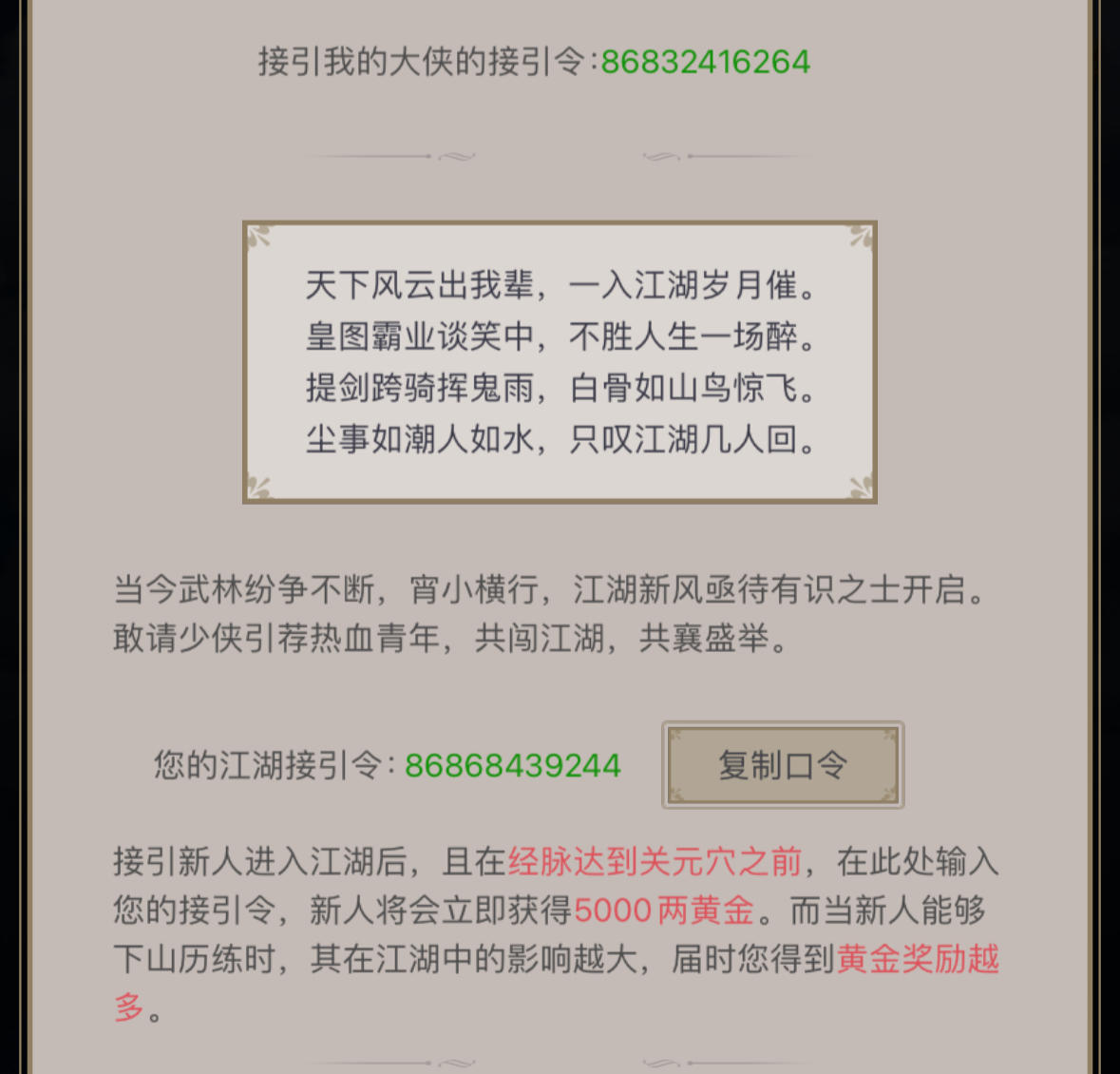 江湖接引令86822507696唯一兑换码a666大区泰山压顶注意在同一个服务器可填写江湖接引令填写处,江湖玄武门江湖接引使兑换码设置兑换码设置里即可填写纯萌新不懂的问题纯萌新不同的问题,大家可以一起交流