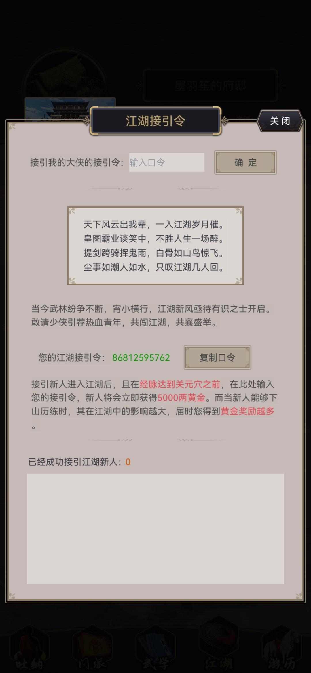 兑换码:a666江湖:曲径通幽接引码:86829265688江湖:不可一世接引码:86819960760#这就是江湖接引码 #这就是江湖礼包码