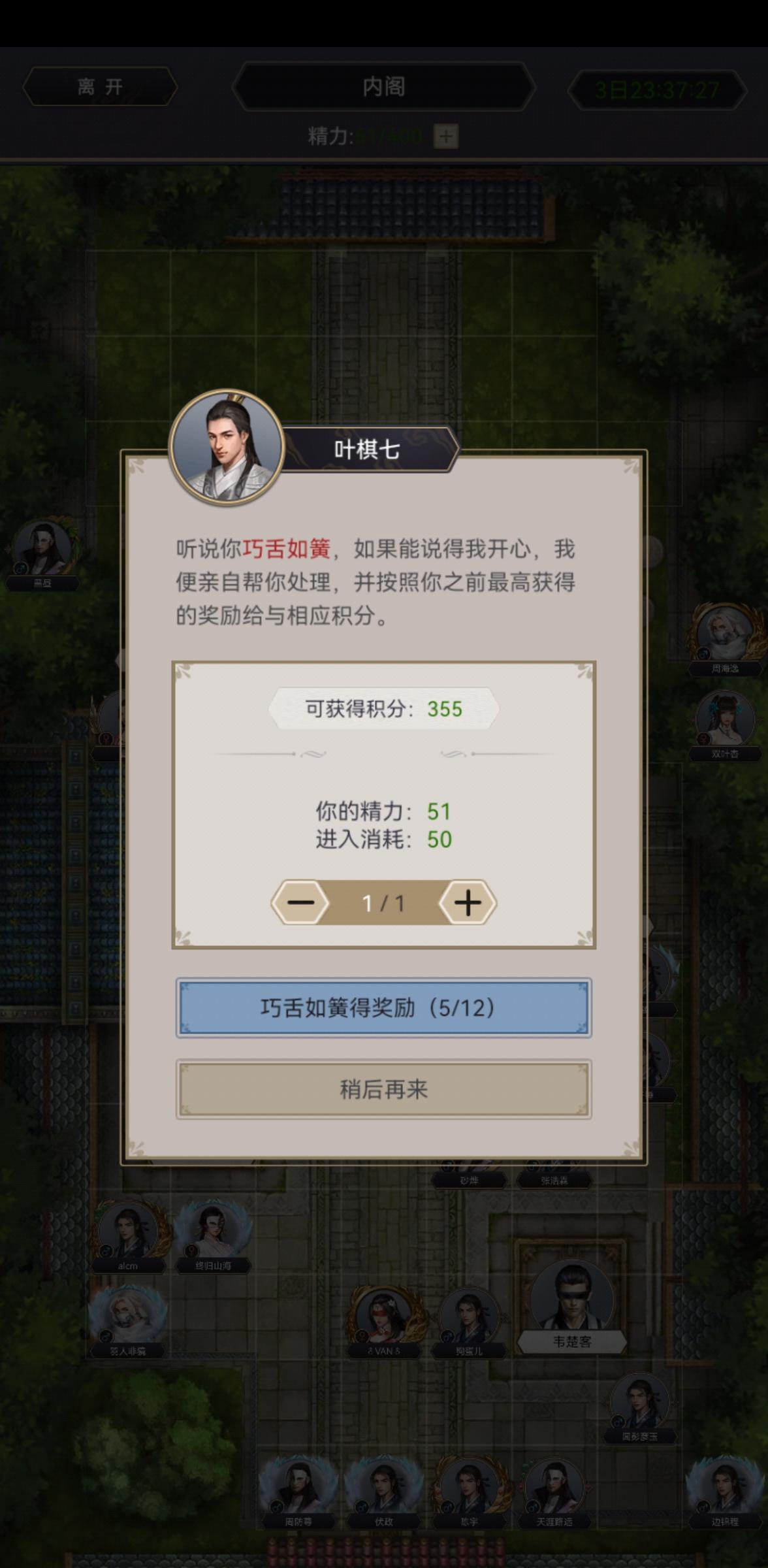 能不能解决一下,吃了我50精力还没有积分,一图完成直接不结算了,退出重进,嘴炮还是我之前十步杀的积分,区和风细雨,id 暮观雪