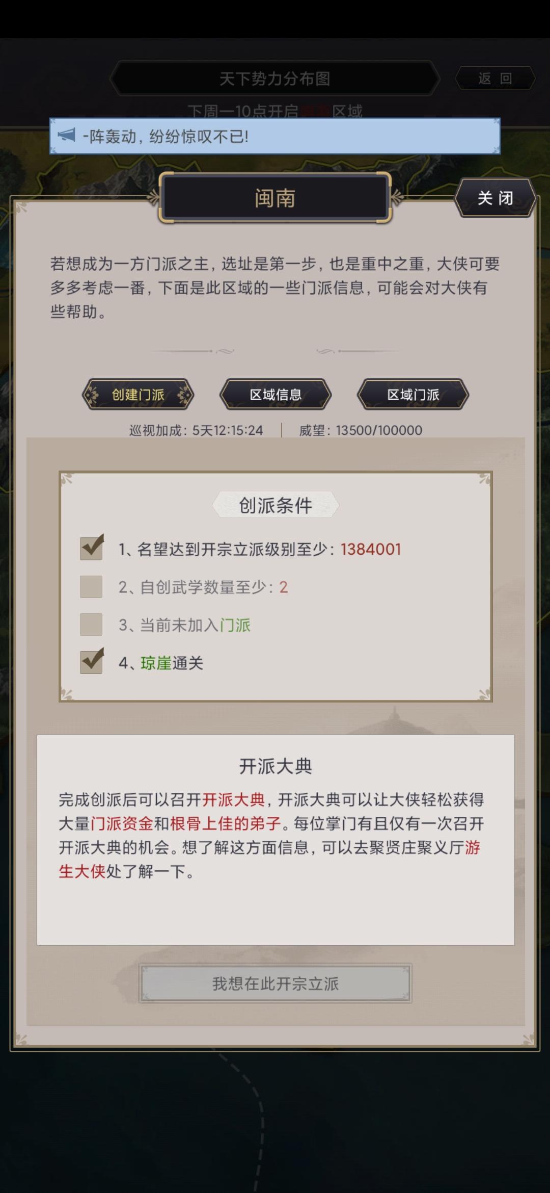 为啥不能开宗立派??已经自创2门武学了,老显示不够。