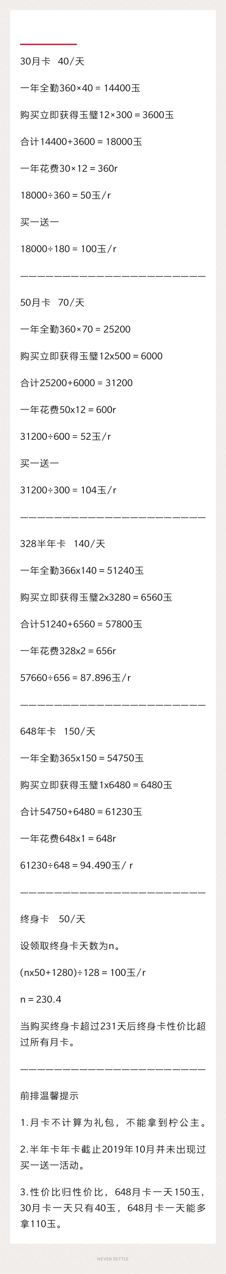 氪金帖【1】月卡/半年卡/年卡/终身卡性价比分析。