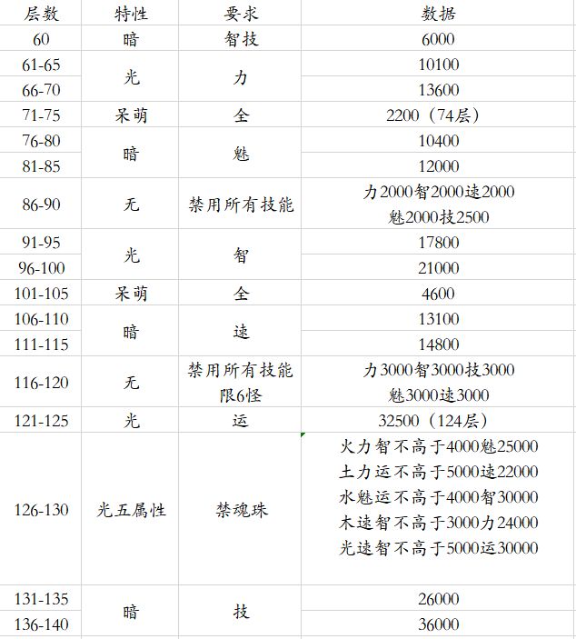 ,60层,,暗,智技6000,70层,,光力,13600,85层,,暗,魅,12000,100层,光,智,21000无光帅版本,,105层,,呆萌,全,4600,115层,暗,速,14800,124层,光,运,32500