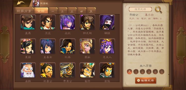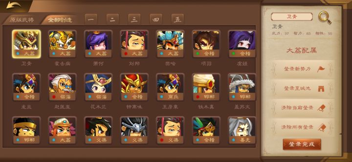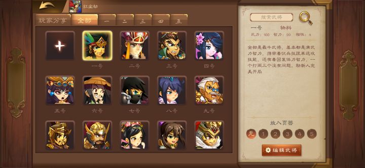 开局一座关卡,15个顶级武将,满属性,携带伏兵技能跟恢复体力智力军师技。一个打两三个妥妥的,适合萌新哦。因为经历过自立为帝被疯狂打,所以想到了这个办法。创建15个顶级武将,用技能可以恢复兵,即使没有兵力也可以依靠着高武力跟体力退后到最边上消耗死对方。