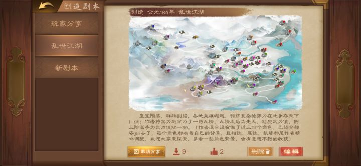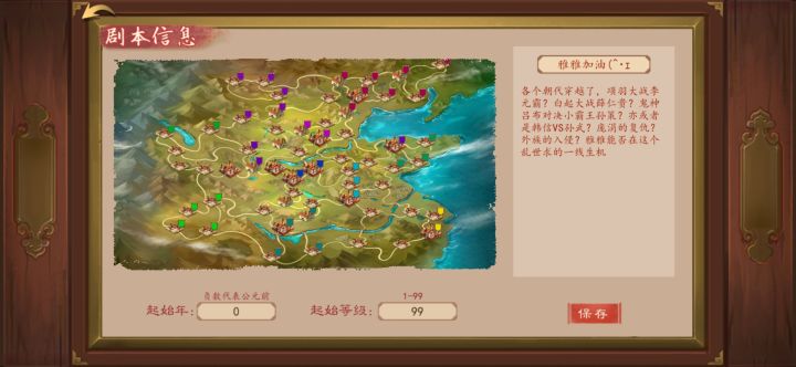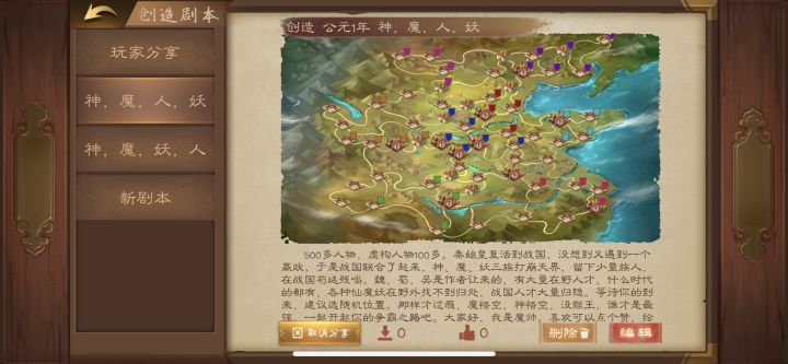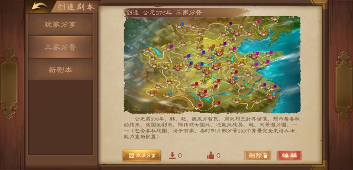 本剧本暂时处于停便更状态,现共有五个势力,每个势力三座城,每个势力五个原创人物,共二十五名原创人物。如果能接受的话欢迎下载剧本,不能接受也没关系,可以下载开国表和名人表两个武将包,总计二十五名人物,背景,人物简介全部原创。下面附武将包截图+剧本截图