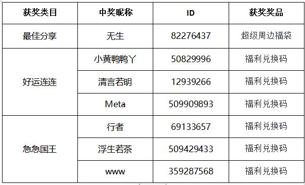 ————开奖分割线—————恭喜以下团长获得本次活动奖励,请于2023年2月28日12:00前联系官方QQ:800127512领取与兑换奖励,逾期未登记将视为放弃领奖。活动奖励将在完成所有获奖玩家登记后统一安排发放。本次活动未参与或未获得奖励的团长请不要灰心,我们的活动获奖概率极高!后续还会有相应活动陆续推出,还请多关注《环形战争》论坛!——————————————亲爱的佣兵团长:我们在