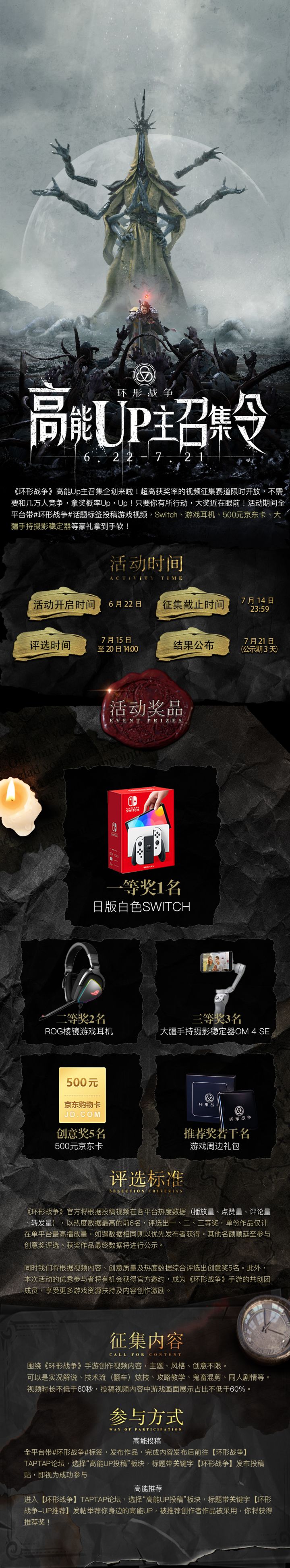 《环形战争》高能Up主召集企划来啦!第一期视频征集活动正在进行中~▶ 征集时间:2022年6月22日-2022年7月14日▶ 征集内容:围绕《环形战争》手游创作视频内容,主题、风格、创意不限。↓↓↓ 详细活动内容,请下拉长图查看 ↓↓↓以上活动全平台开放投稿入口,请自行选择平台投稿,带#环形战争#标签发布作品后,前往【环形战争】TapTap论坛,选择“高能UP投稿”板块,发帖提交你的投