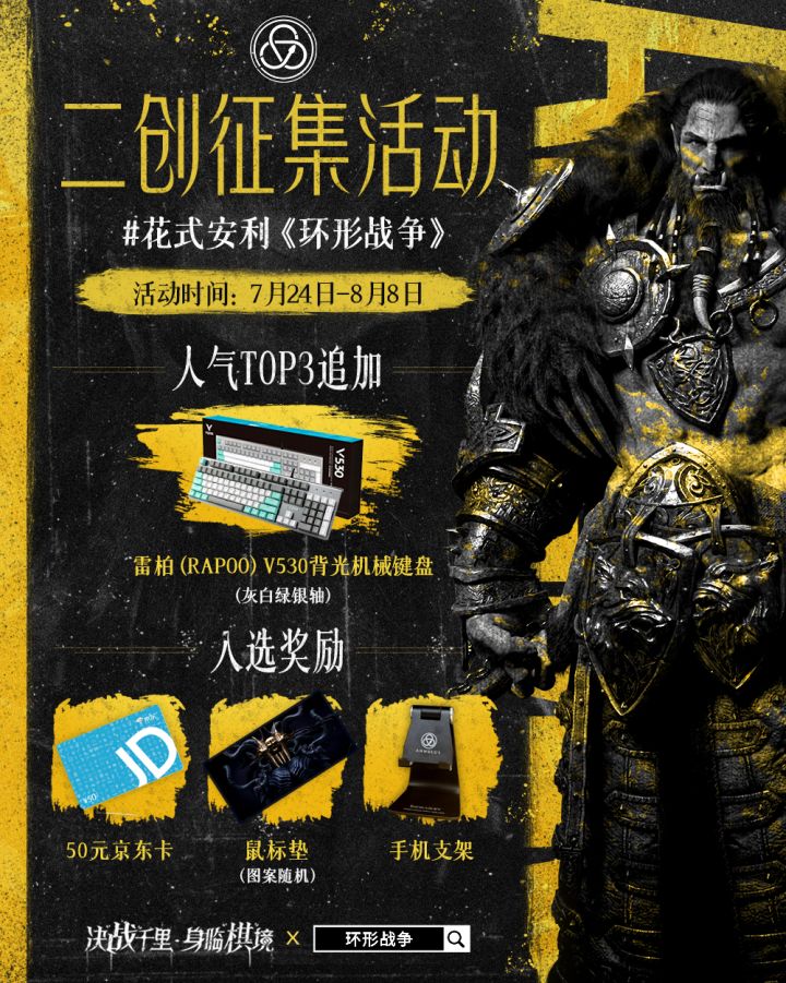 ★活动时间★7月24日-8月8日24:00★征集主题★花式安利《环形战争》,图文、同人创作、视频等作品形式不限。怎么样更容易入选?举个栗子🌰:①表情包/同人剧情投稿(脑洞打开,格局打卡,花式玩梗!)②视频制作(游戏评测、翻车实况、鬼畜卡点等)③玩家攻略(阵容养成、通关思路、经验分享等)★活动奖励★人气TOP3:雷柏(Rapoo)V530机械键盘我们将根据作品综合质量和站内热度(