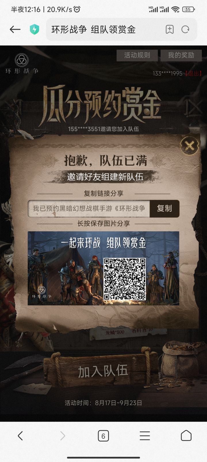 《还差一个人》我已预约黑暗幻想战棋手游《环形战争》,加入我的佣兵团,100%领佣兵大礼包!https://hd.indragame.com/annulus/invite/?team_mark=E9w3Bk61YQdJRJdOGpJZn4W8VZ7k1oYq9wdLRXajPXgEBG3Q