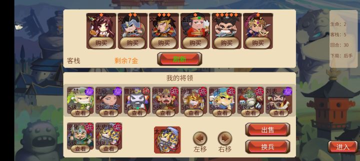 第五关,拿一个武将,再把其他武将中最适合拿弓的变成弓兵,顺利的话,酒馆可以升到四级。四级武将中,有曹操 孙策 张辽 司马懿都是通关必备武将,所以接下来两关可以不急着升级酒馆,先试几次能不能刷到这几个(不强求),如果来了司马,前期的田丰和孔融就可以卖了。
