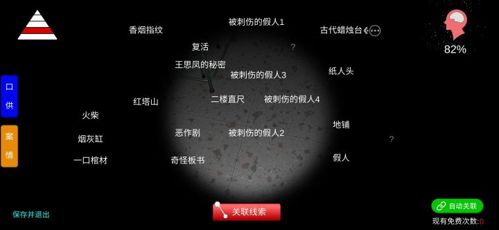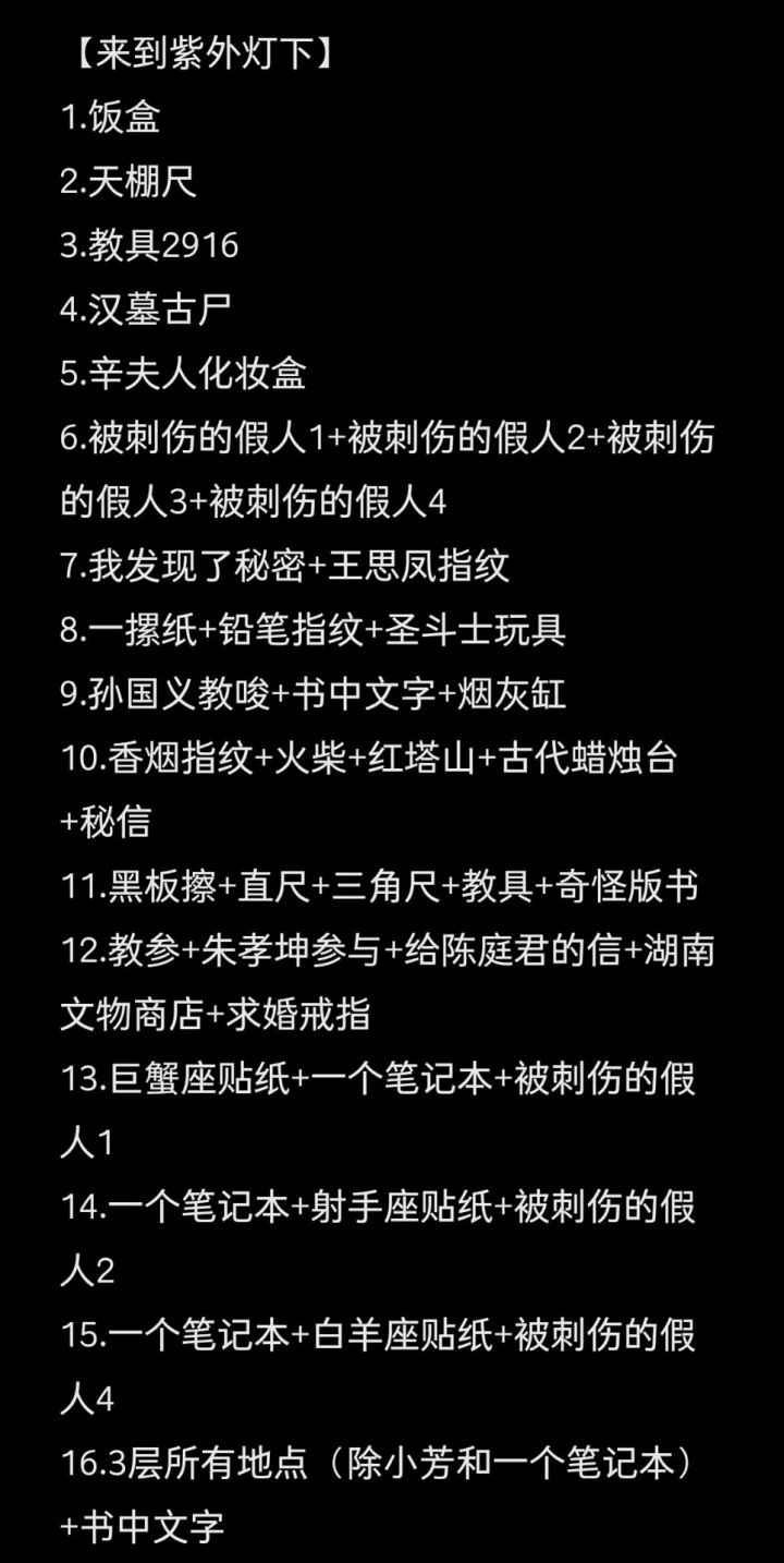 1.紫外线灯:可以照古尸照片和天蓬尺 2.放大:2b铅笔指纹,香烟指纹,抽屉里〖有秘密〗指纹。 3.刺伤的假人一共有四个,能组成一个线索 4.教具的密码在二楼黑板上可以自己算。
