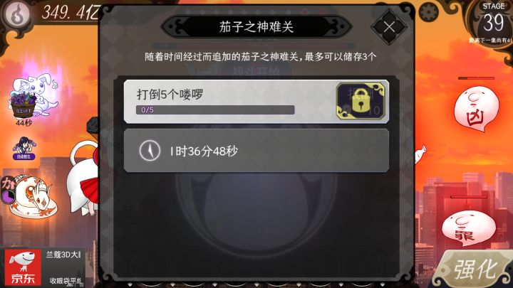 游戏初期妥妥的拼手速,已经好不容易来的茄子神技能,恢复要很久,害,狐狸和兔子的作用太小了,射速慢点,威力就大点吧也行,偏偏速度慢威力小,我都快急眼了,纯肝游戏