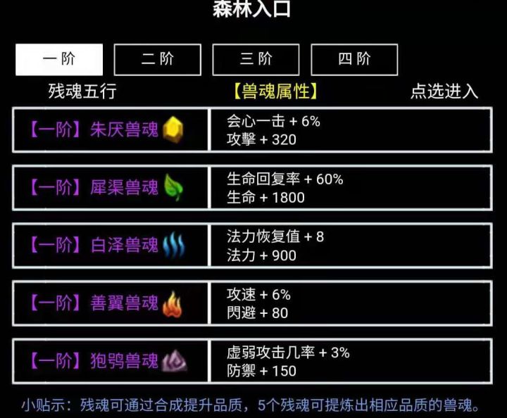 兽魂怎么管理现阶段兽魂有四阶,一阶可以带一个,所以进图的道友要考虑清楚了再进图,进图前先看地图上的兽魂最高属性介绍,是的,这是最高级,没石头也许就止步于红色兽魂,进图钱看上半分钟,换来的是道友进了森林不会迷路,能快速收割利益,何乐而不为呢我?进图后大家都各凭气运了,气运不足者中陷阱降攻击防御血量和蓝,也有医生巧合的遇上你,给钱消灾不?看各位道友钱包里的钞能力了。遇上美女呼救,本以为是福利,哪