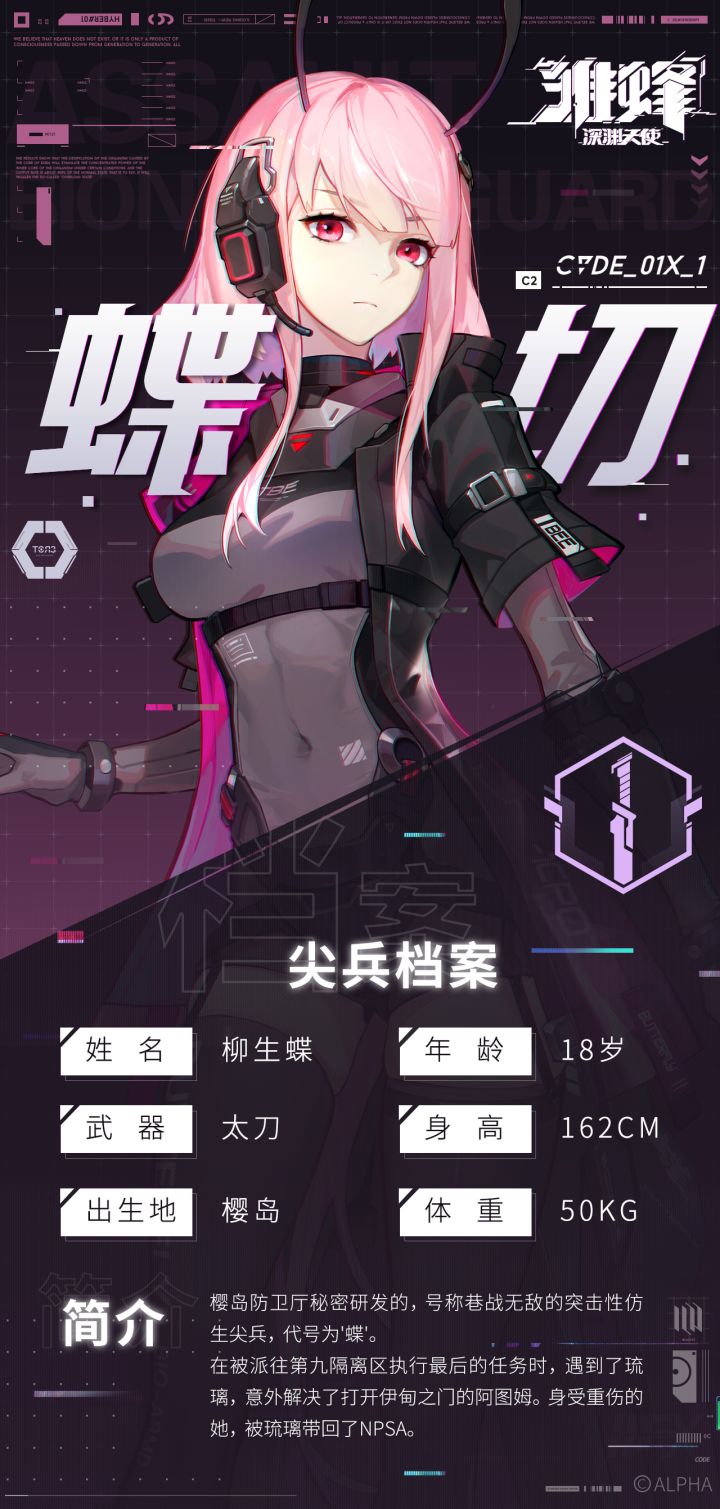 //你好,尖兵。欢迎登录NPSA档案库。//尖兵数据#序列001——蝶切//爱丽丝正在解码数据……职业:蝶切姓名:柳生蝶出生地:樱岛武器:太刀人生经历:—— “作战开始!”樱岛防卫厅秘密研发的,号称巷战无敌的突击性尖兵,行动代号“蝶”。在被派往第九隔离区执行最后的任务时,遇到了琉璃,意外解决了打开伊甸之门的阿图姆。身受重伤的她,被琉璃带回了NPSA。官方预约站:官方微博:@