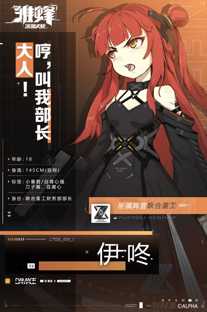 //你好,尖兵。欢迎登录NPSA档案库。//人物资料#序列002——伊咚//爱丽丝正在解码数据……姓名:伊咚年龄:18身高:145cm(自称)身份:联合重工财务部部长标签:小暴君/自尊心强/刀子嘴、豆腐心所属阵营:联合重工人物经历——“哼,叫我部长大人!”“联合重工育儿园”是为了培育忠于联合重工的员工而设立的福利性孤儿院,伊咚自幼生活于此。小时候伊咚就展现出对数字方面的高度