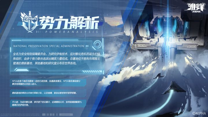 //你好,尖兵。欢迎登录NPSA档案库。//势力组织#序列001——NPSA//爱丽丝解码资料中……组织名称:NPSA组织全称:National Preservation Special Administration组织简介:全名为安全特别保障委员会。为研究伊甸技术、应对骸化危机而诞生的特殊组织,由多个势力联合选派出精英力量组成。总基地位于胜利市周围戈壁滩的鼎新基地,其他基地和研究室分