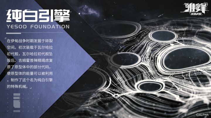 //你好尖兵,欢迎登陆NPSA档案库//解禁资料#序列002——纯白引擎//爱丽丝解码资料中......//纯白引擎 Yesod Foundation[附录①]在反复的实验中,纯白引擎被证实拥有收容伊甸能量的用途,但因为伊甸能量的特殊性,只有极少数的特殊尖兵,才能装载这个引擎。[附录②]纯白引擎于瓦尔哈拉舰上的虚拟显示是一棵树,树上规律环绕着七个承托基盘,用于收容伊甸方块—— 唯一的问题