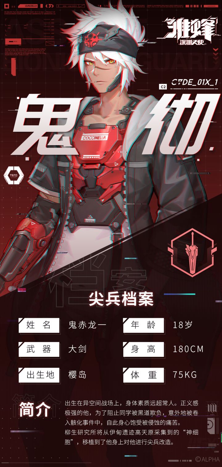 //你好,尖兵。欢迎登录NPSA档案库。//尖兵数据#序列003——鬼彻//爱丽丝正在解码数据……//职业:鬼彻//姓名:鬼赤龙一//出生地:樱岛//武器:大剑//人生经历—— “来吧!战个痛快吧!”出生在异空间战场上,身体素质远超常人。正义感极强的他,为了阻止同学被黑道欺负,意外地被卷入骸化事件中,自此身心饱受被侵蚀的痛苦。柳生研究所将从伊甸遗迹高天原采集到的“神细胞”,移植