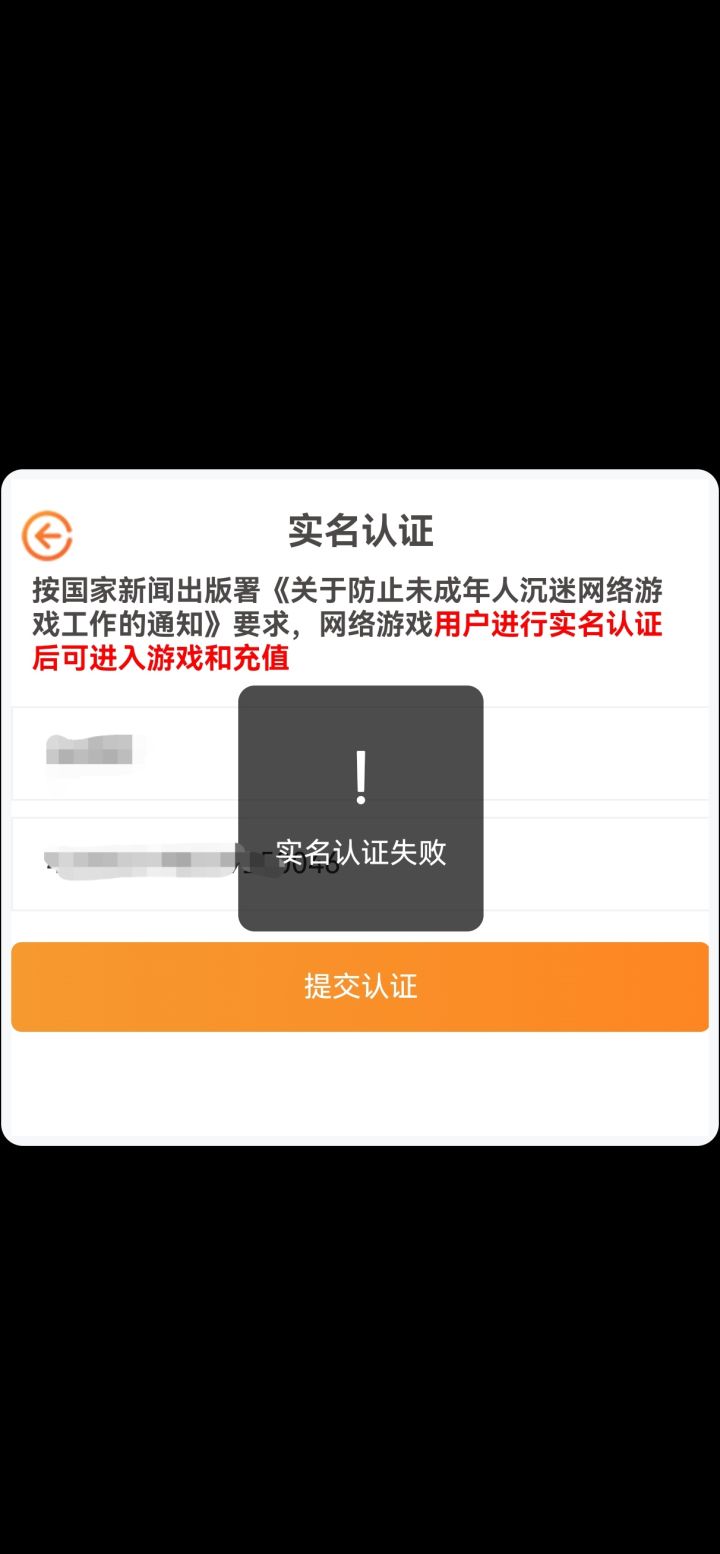 卡在实名认证界面,显示认证失败。