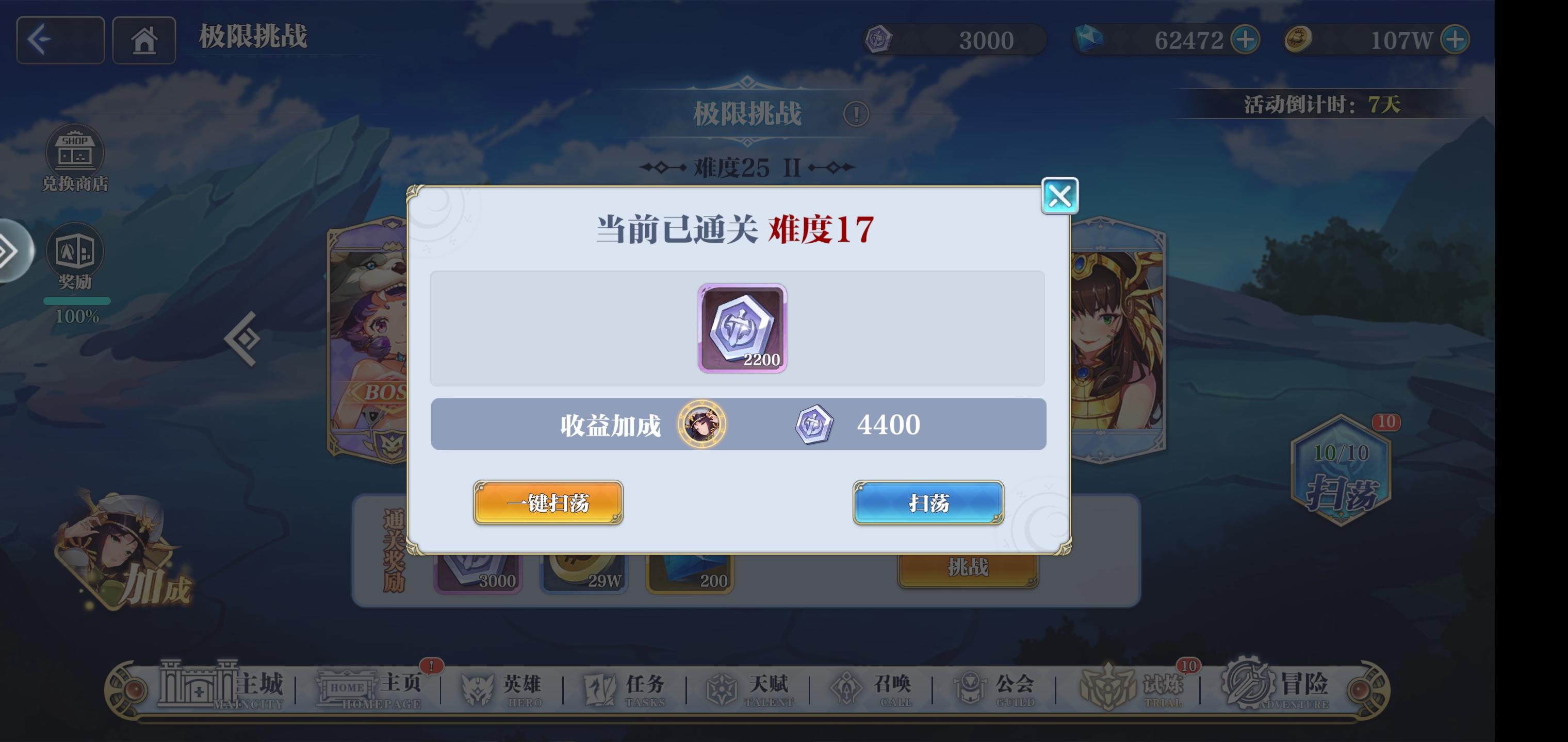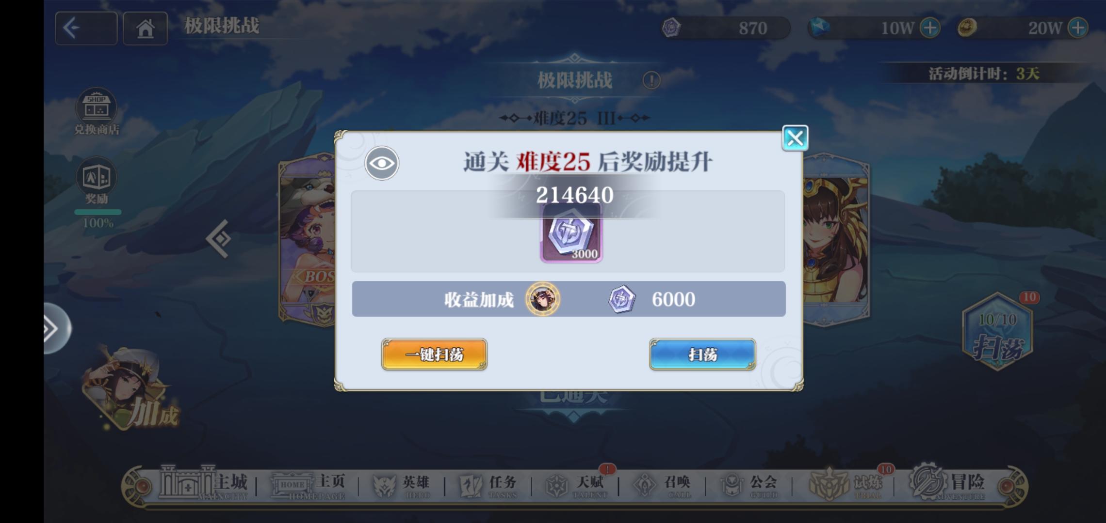 打完25层,更新后非单人打通的不算了,重新打也没用,扫荡只能扫荡到单人通关的。。。