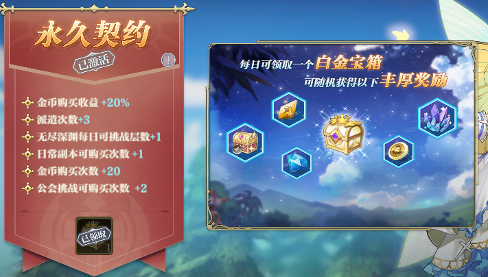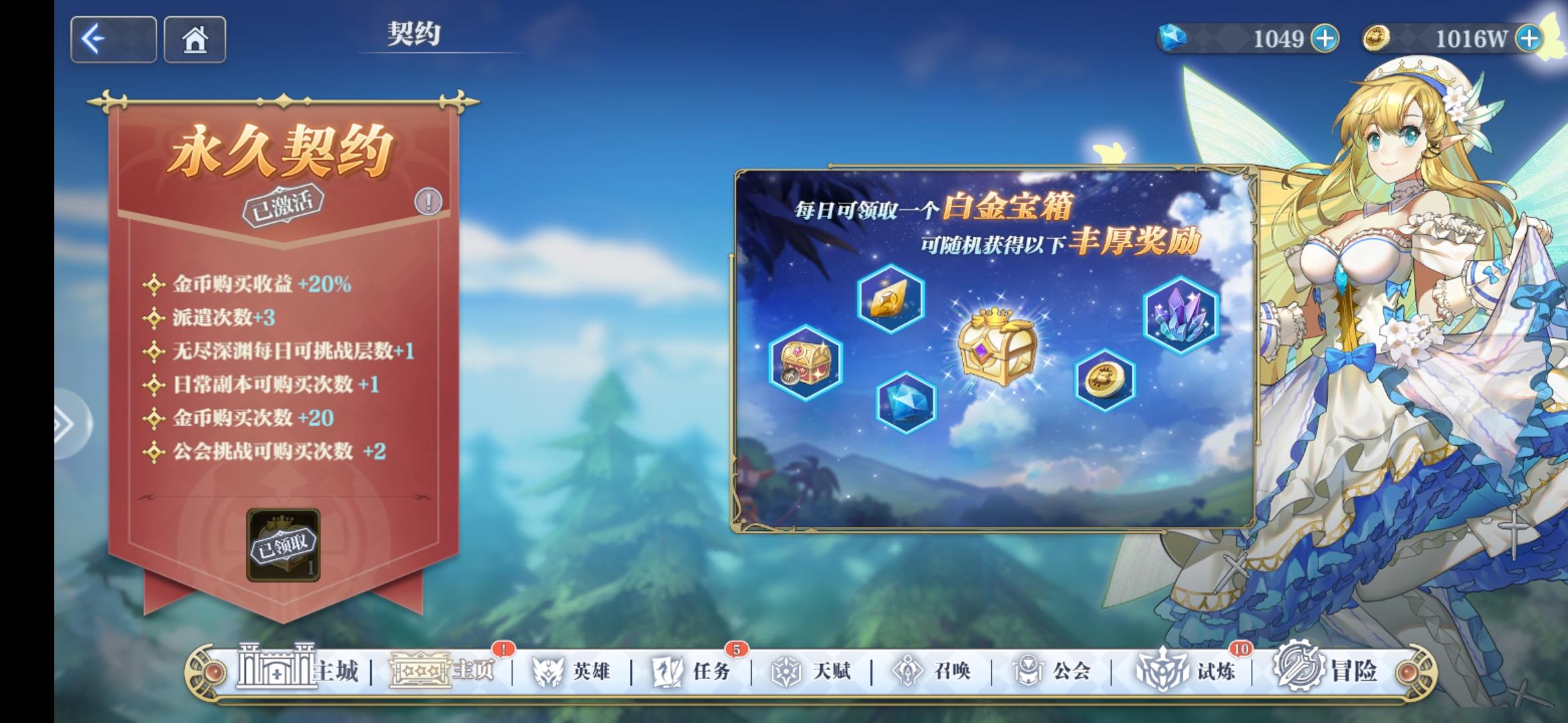 今天开出金币了,才90万。还没有每天幻境给的多,太鸡肋了,不如去掉吧,我给你们做主了,4样物品随机的话,还能勉强接受。1个宝箱,10个材料水晶,500钻石,1个精炼石,我觉得这才对得起永久契约的价值。派遣次数+3,这个有必要存在吗,一天才24小时,一次任务就12小时,这个完全没必要增加,还不如加到无尽每天+2和日常每天+2,比较合理。