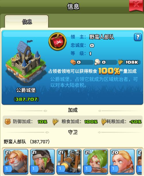 公爵城堡是单块大陆中最为重要的战略性要塞,也是争夺王城成为大陆霸主的唯一资格来源,成为公爵不仅可以享受到区域内最高BUFF加成,还能对所在区域所有领主进行资源征收。公爵城堡BUFF:(防御加成10%,粮食加成100%,耗粮减少50%)公爵城堡享有区域内最高BUFF加成,相当于一座高级要塞。公爵城堡开启条件:所在区域内要塞占领数量达到135(在未达到开启条件时,公爵城堡会有保护罩)占领公爵城