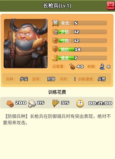 兵种概况:长枪兵,1级步兵防御兵种,擅长防御骑兵进攻。攻击极低,对步兵和弓兵也有一定的防御效果。建筑兵营和学院达到十级,解锁领主府建筑后,使用5点天赋方可解锁。推荐英雄:威廉:长枪兵种指定推荐英雄。使用期间,所有长枪兵种加20%防御。适用于联盟战中,多名防御手的共同联防,专精抵挡骑兵攻击。肖恩:步兵兵种指定英雄。使用期间,所有步兵兵种加10%攻防。泛用性比较好。(所有