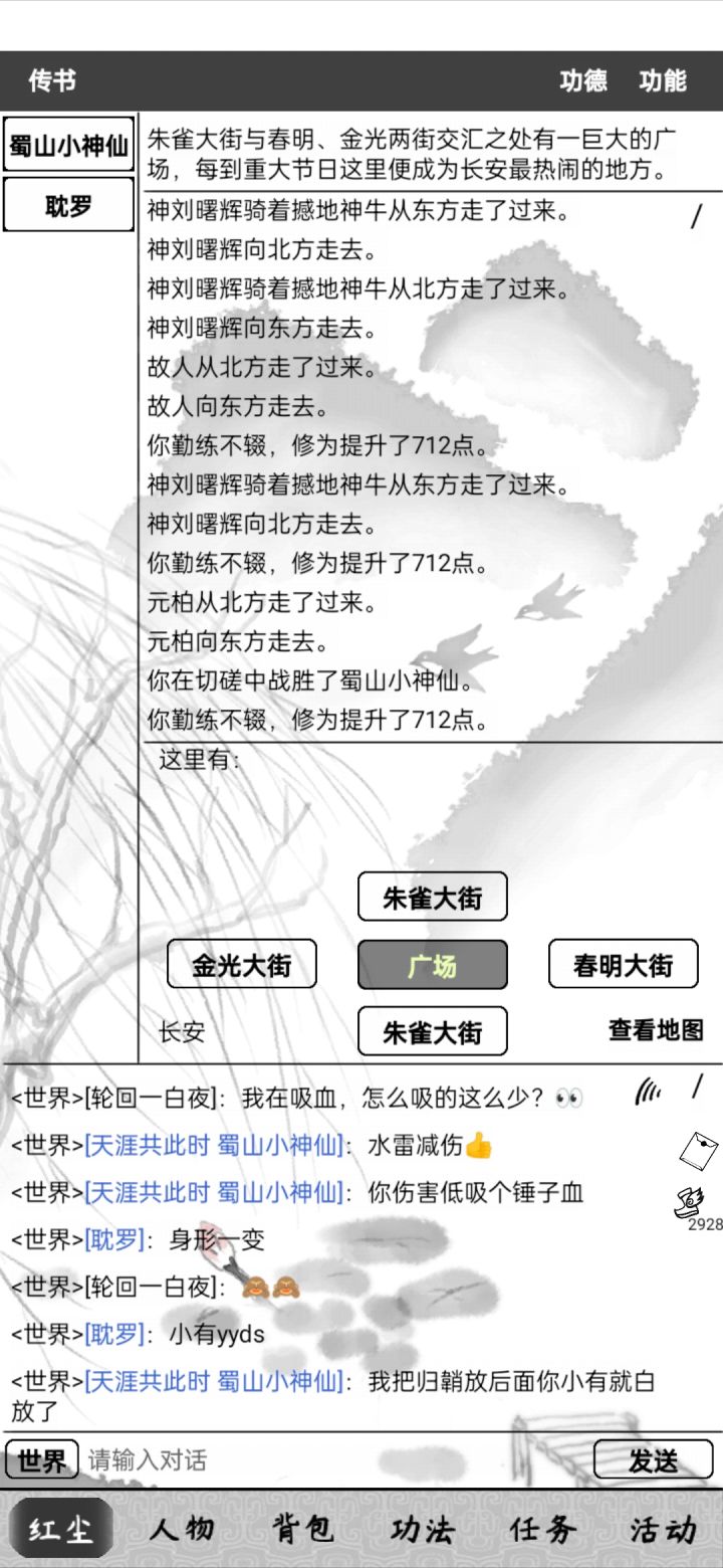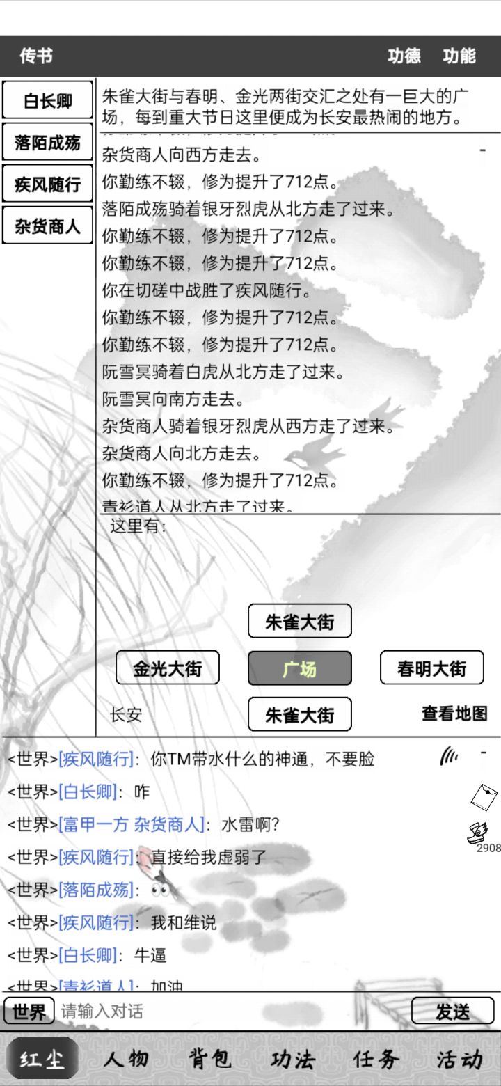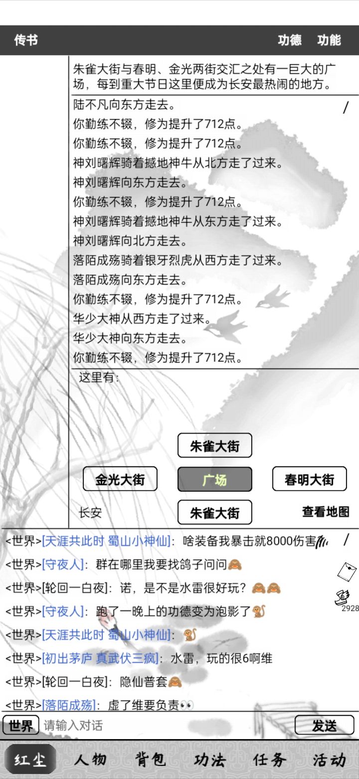 2、然后世界频道询问是否有大哥有时间带你进门派,一区姐姐们都很热情,都会带你去门派。